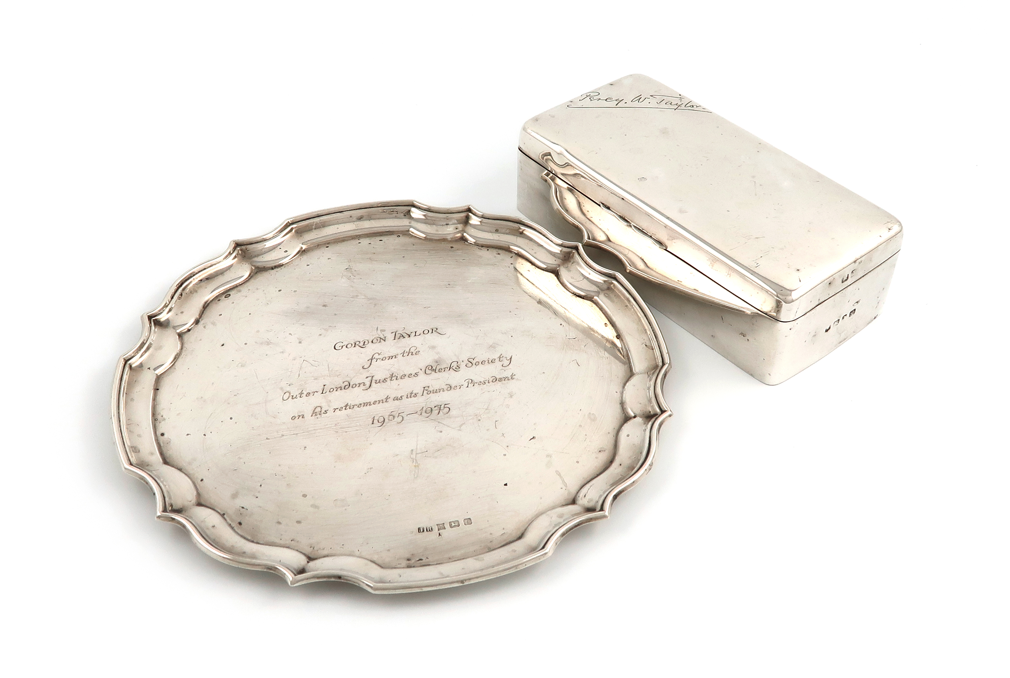circular form, moulded border, the centre inscribed, diameter 25.3cm, plus a late-Victorian silver cigarette box, of rectangular form, the hinged cover inscribed, Birmingham 1899, approx. weighable 13oz. (2)