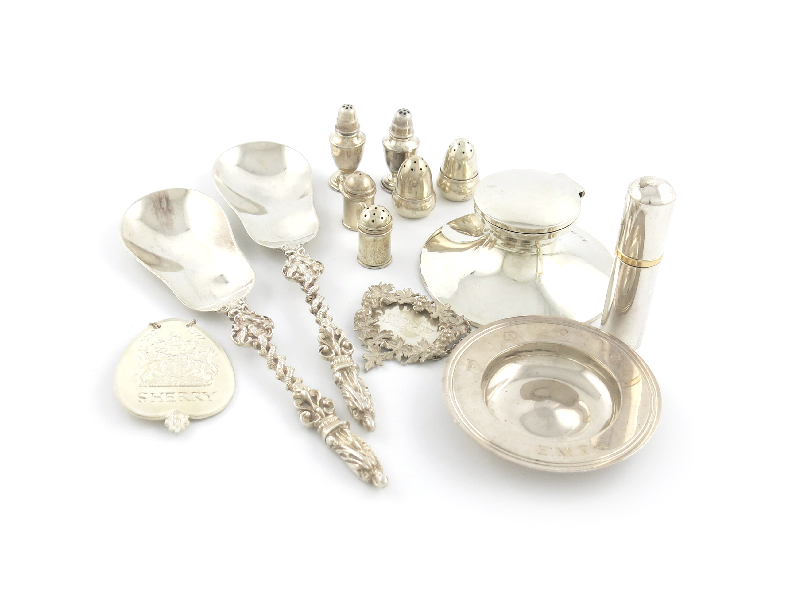 comprising: a pair of Victorian fruit serving spoons, with Apostle finials, by William Hutton and Sons, London 1896, a capstan inkwell, an armada dish, a pair of miniature acorn pepper pots, a pair of French miniature pepper pots, two wine labels, an atomiser, and a pair of metalware miniature kitchen salt and pepper pots, approx. weighable 8.4oz. (13)