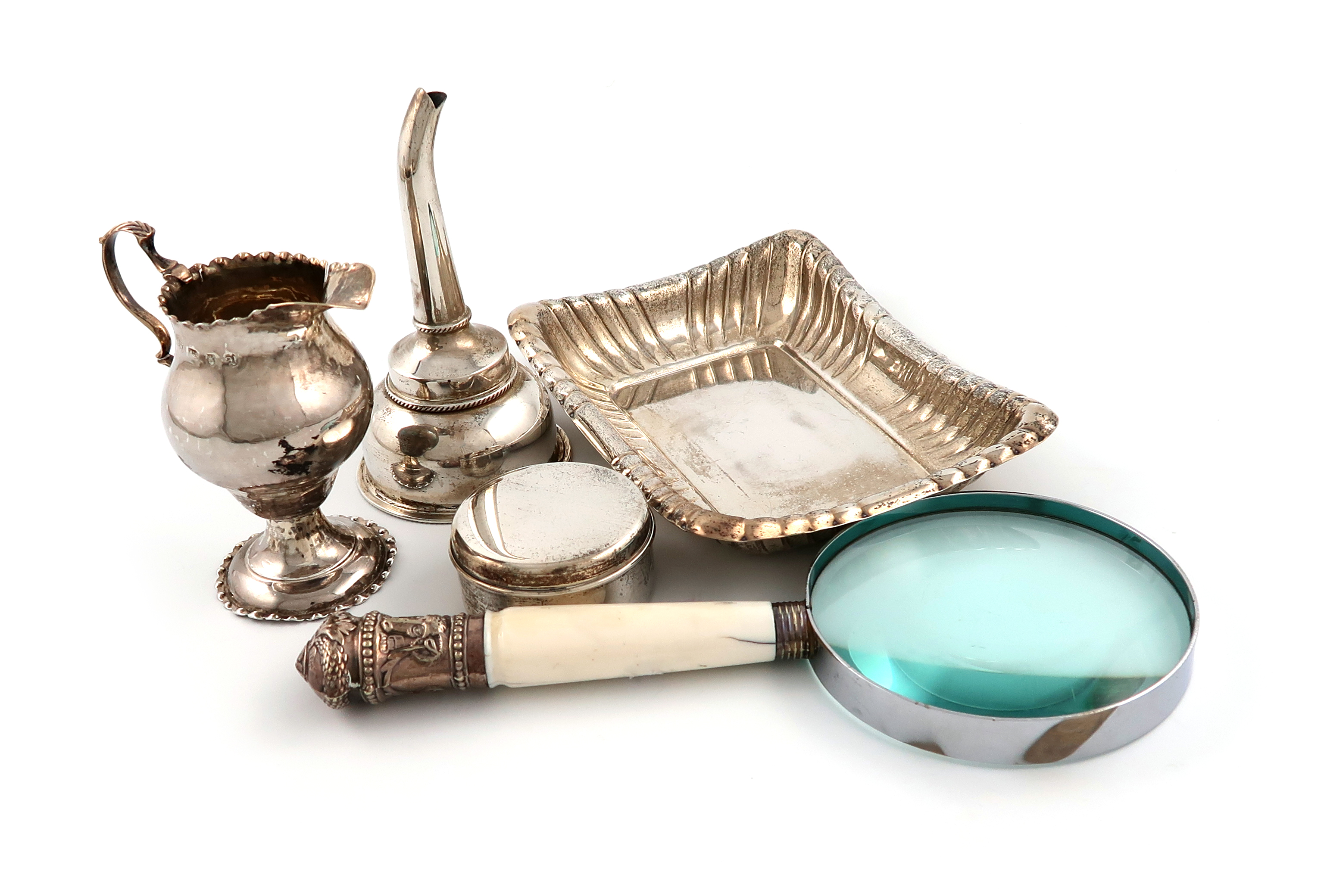 comprising: a George III cream jug, of baluster form, by Appleton and Smith, London 1776, an American dish of fluted rectangular form, a modern wine funnel, Birmingham 1996, a circular Tiffany box, velvet lined, and an earlier ivory knife handle converted to a magnifying glass, approx. weighable 10oz. (5)