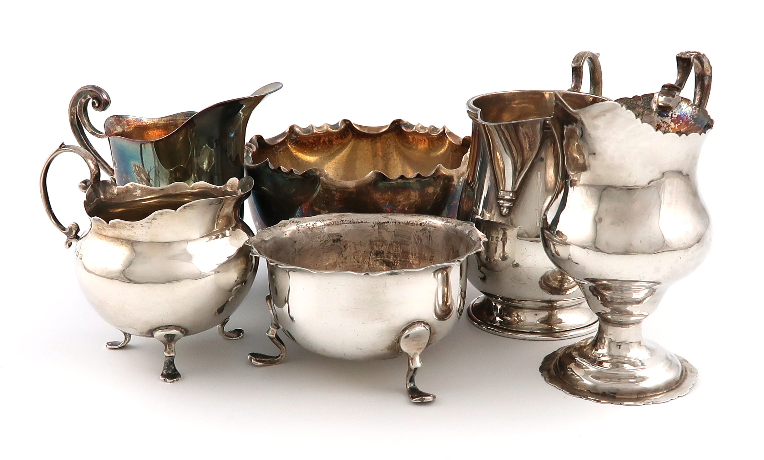 comprising: a George III cream jug of baluster form, London 1775, leaf capped scroll handle, engraved with a crest, three further cream jugs and two sugar bowls, approx. weight 19.5oz. (6)