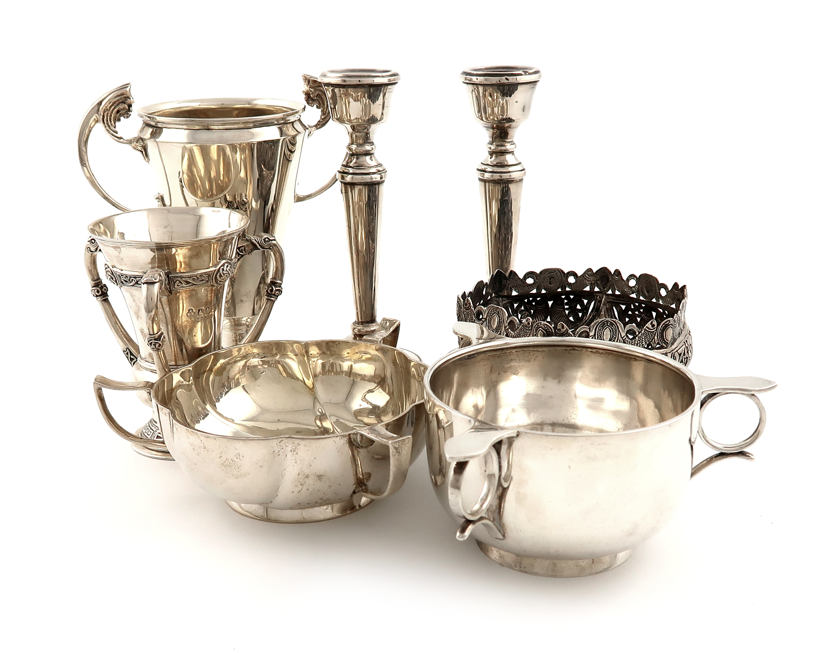 comprising: an Irish Tyg, by S.D. Neill, Dublin 1905, with Celtic decoration, a pair of candlesticks, a trophy cup and two three-handled sugar bowls, plus an Indian bowl, approx. weighable 27oz. (7)