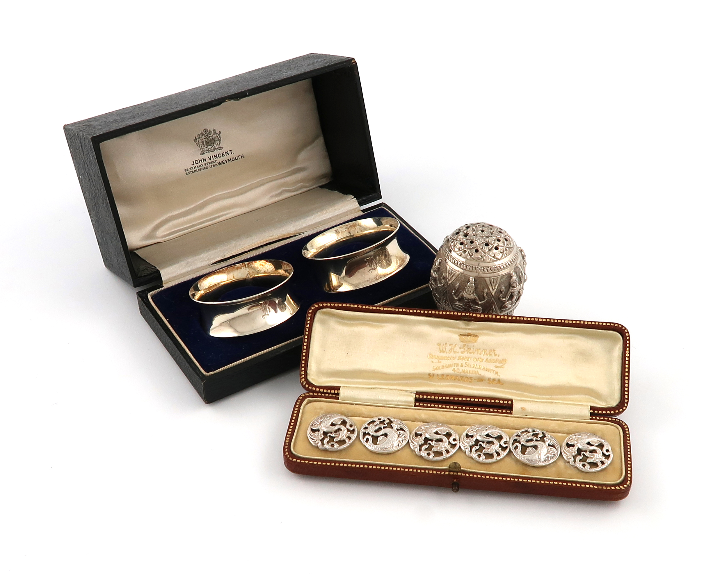 circular form, pierced and chased with dragons, in a fitted case, plus a cased pair of napkin rings, Birmingham 1919 and an Indian pepper pot, with chased decoration, approx. weight 2.5oz. (9)