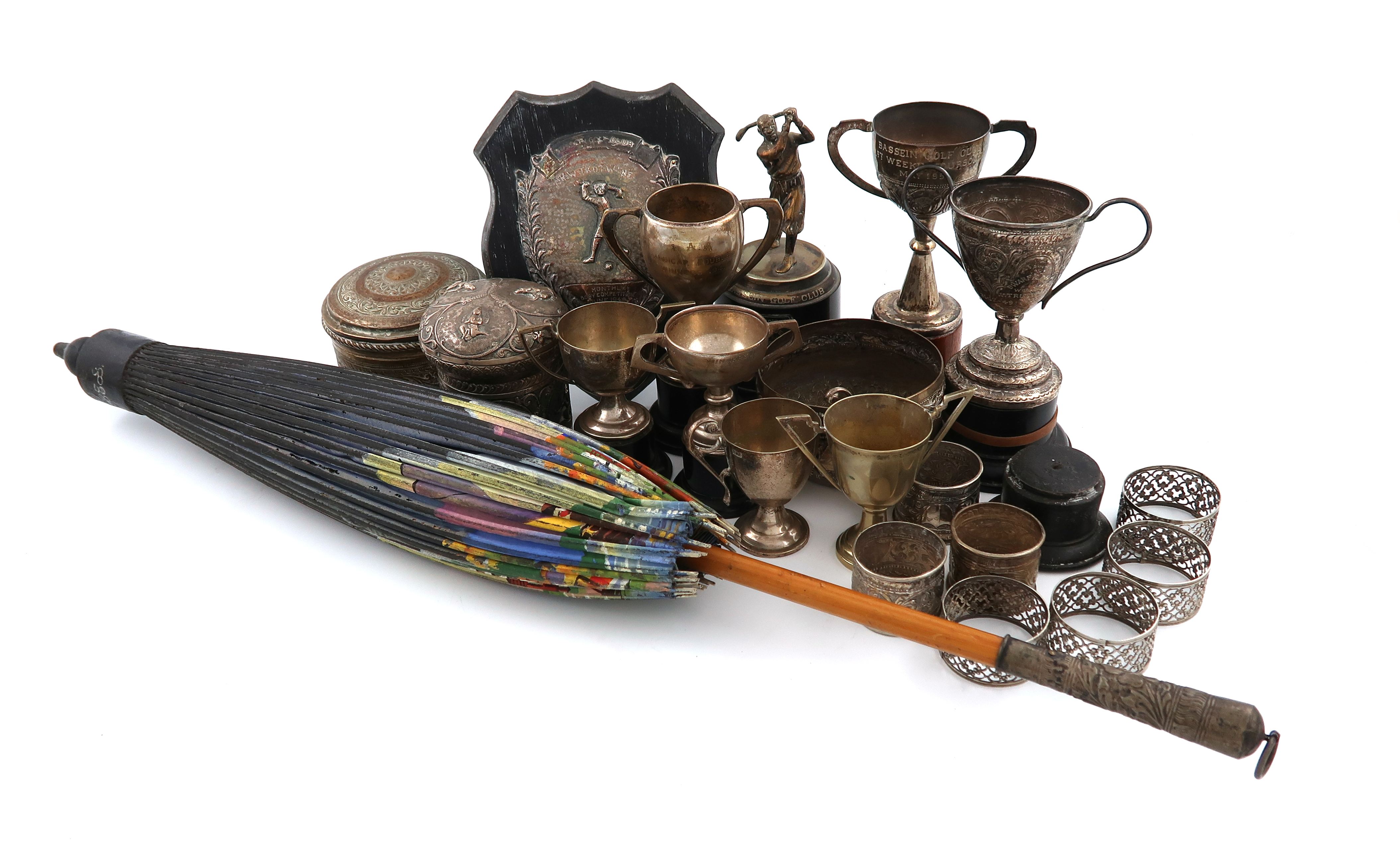 comprising: two trinket boxes and covers, two trophy cups, a bowl and a trophy shield relating to the Bassein Golf Club, a metalware handled parasol, and three napkin rings, plus electroplated items: a golf trophy modelled as a golfer in full swing, four napkin rings and various trophies. (qty)