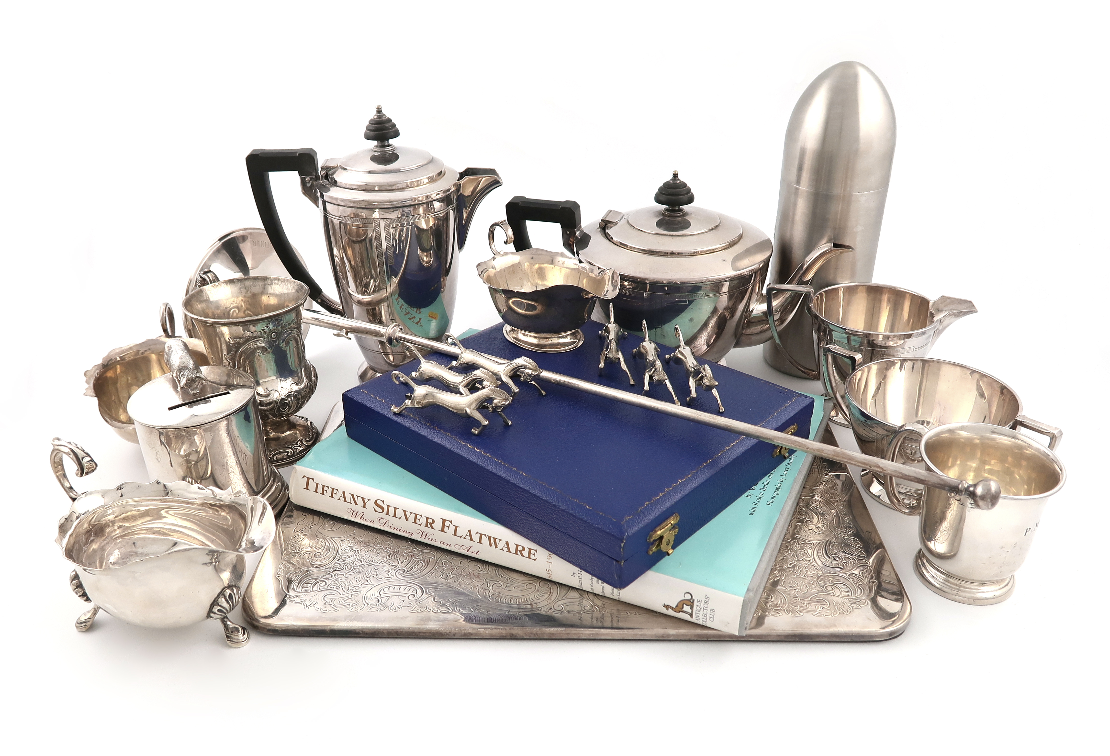comprising silver items: a Victorian mug, London 1851, three single sauce boats, a mug, a Finnish miniature flag pole, plus electroplated items: a four-piece Art Deco tea set, a cased nut pick set, a money box, and other items including a book on Tiffany flatware, approx. weighable 20oz. (qty)