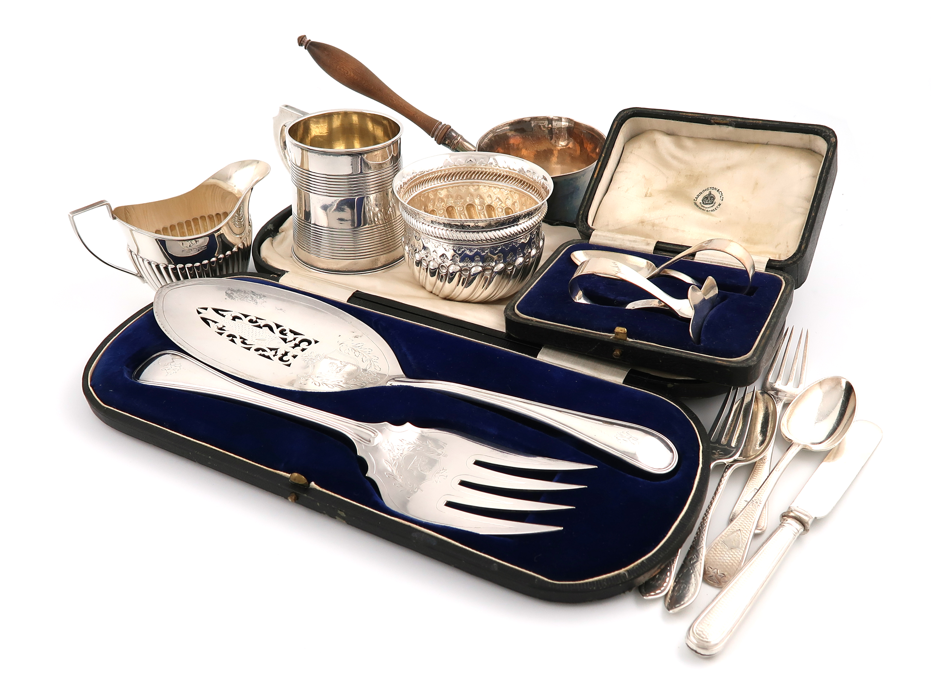comprising: a George III mug, London 1810, tapering circular form, with an upper and lower band of reeded decoration, plus a sugar bowl, a brandy pan, marks worn, a cream jug, a cased baby feeder and pusher, a christening fork and spoon, plus a three-piece electroplated christening set and a cased pair of fish servers, approx. weighable 16oz. (qty)