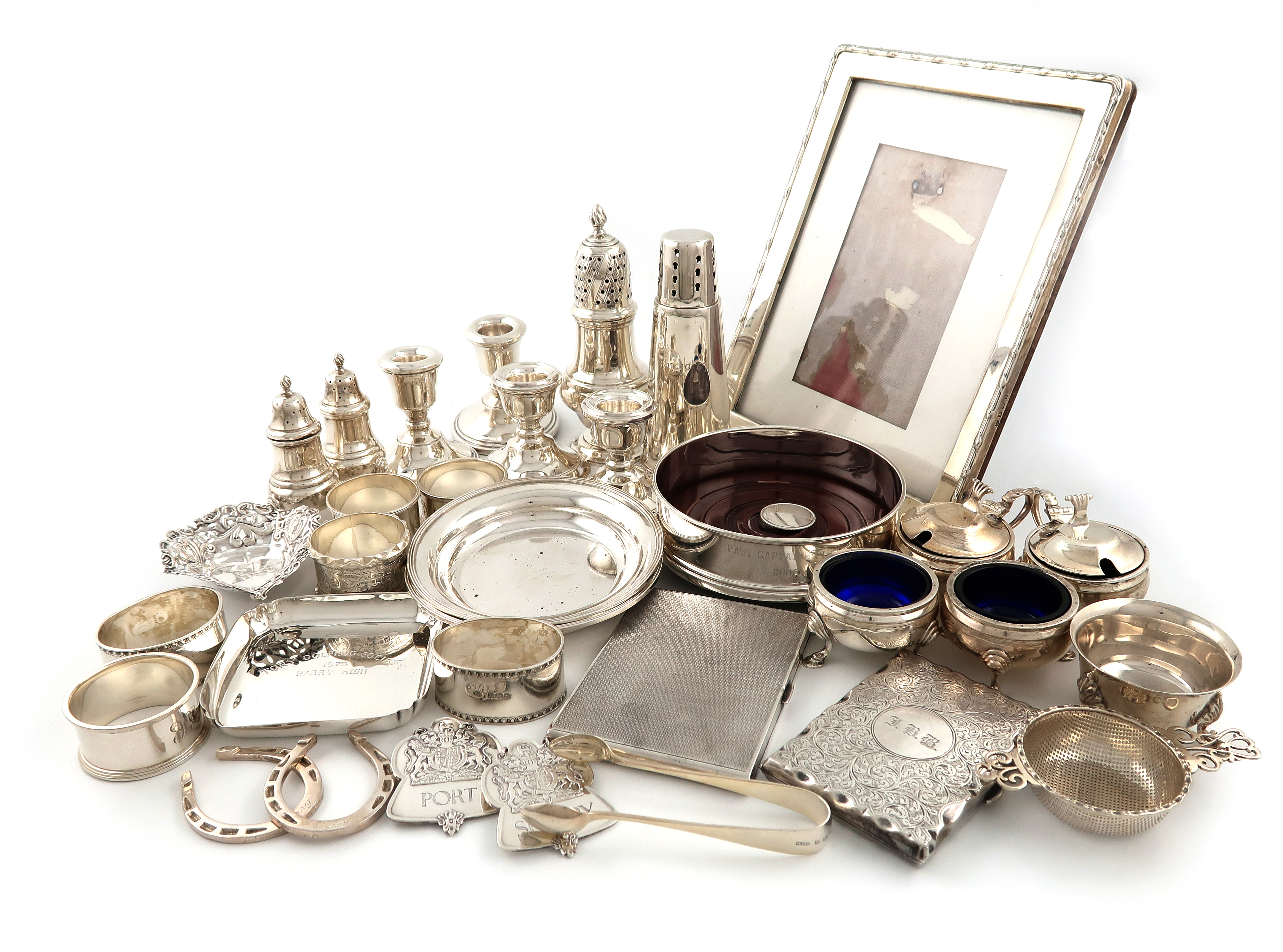 comprising: a six-piece condiment set, by J. B. Chatterley and Sons Limited, Birmingham 1970, a tapering sugar caster, Birmingham 1962, a baluster sugar caster, a single wine coaster, a photograph frame, two pairs of dwarf candlesticks, two cigarette cases, a pair of dishes, an ashtray, a tea strainer and stand, two commemorative Queen's silver Jubilee wine labels, a dish, a pair of horse shoe napkin rings, and six other napkin rings, approx. weighable 54oz. (qty)