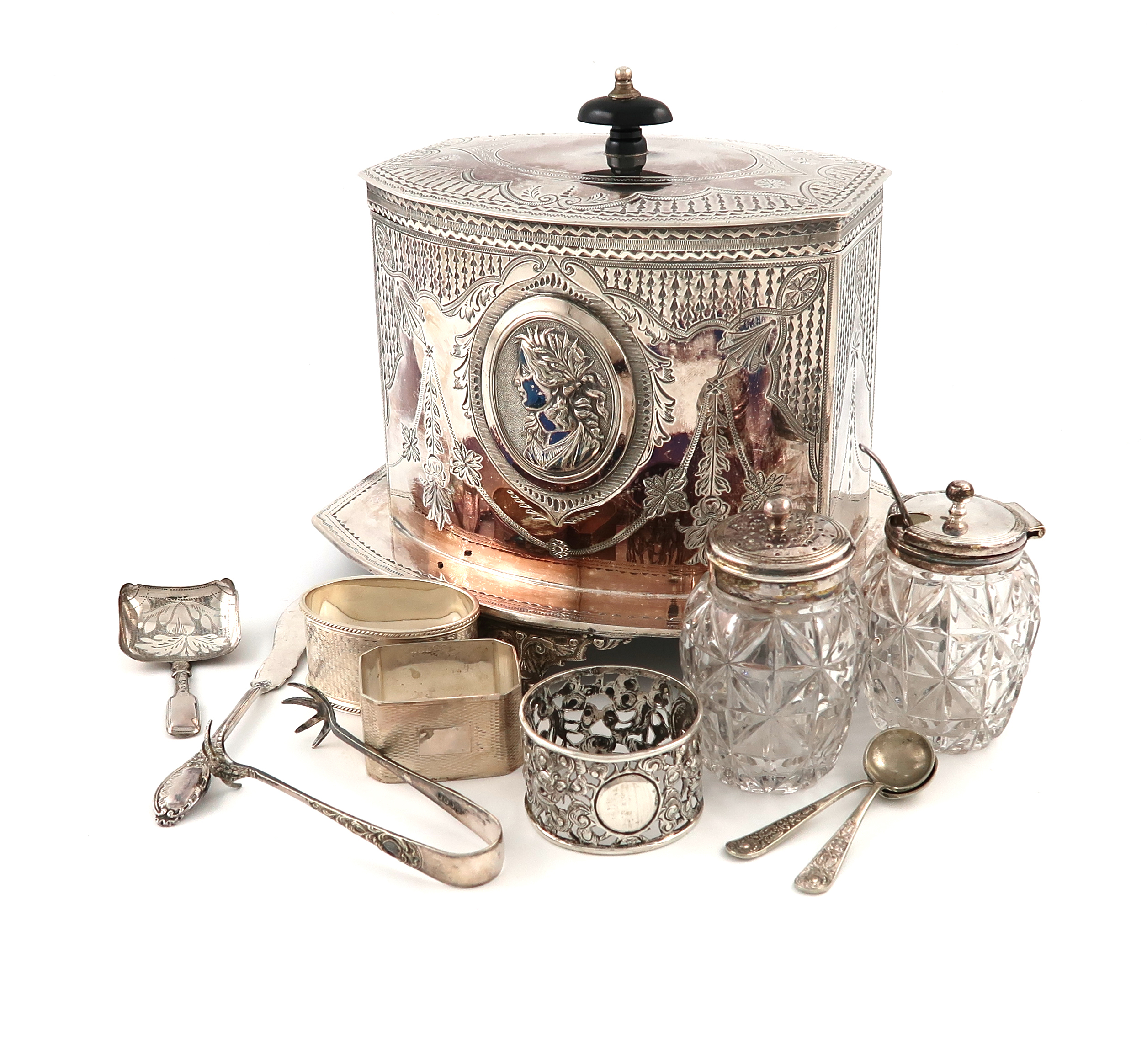 comprising silver items: a George IV caddy spoon, by Unite & Hilliard, Birmingham 1826, rectangular bowl, engraved decoration, Chinese napkin ring, two further napkin rings, plus electroplated items: a biscuit box of shaped rectangular form, the front applied with a medallion, plus two condiments and five items of flatware, approx. weighable 2.9oz. (qty)