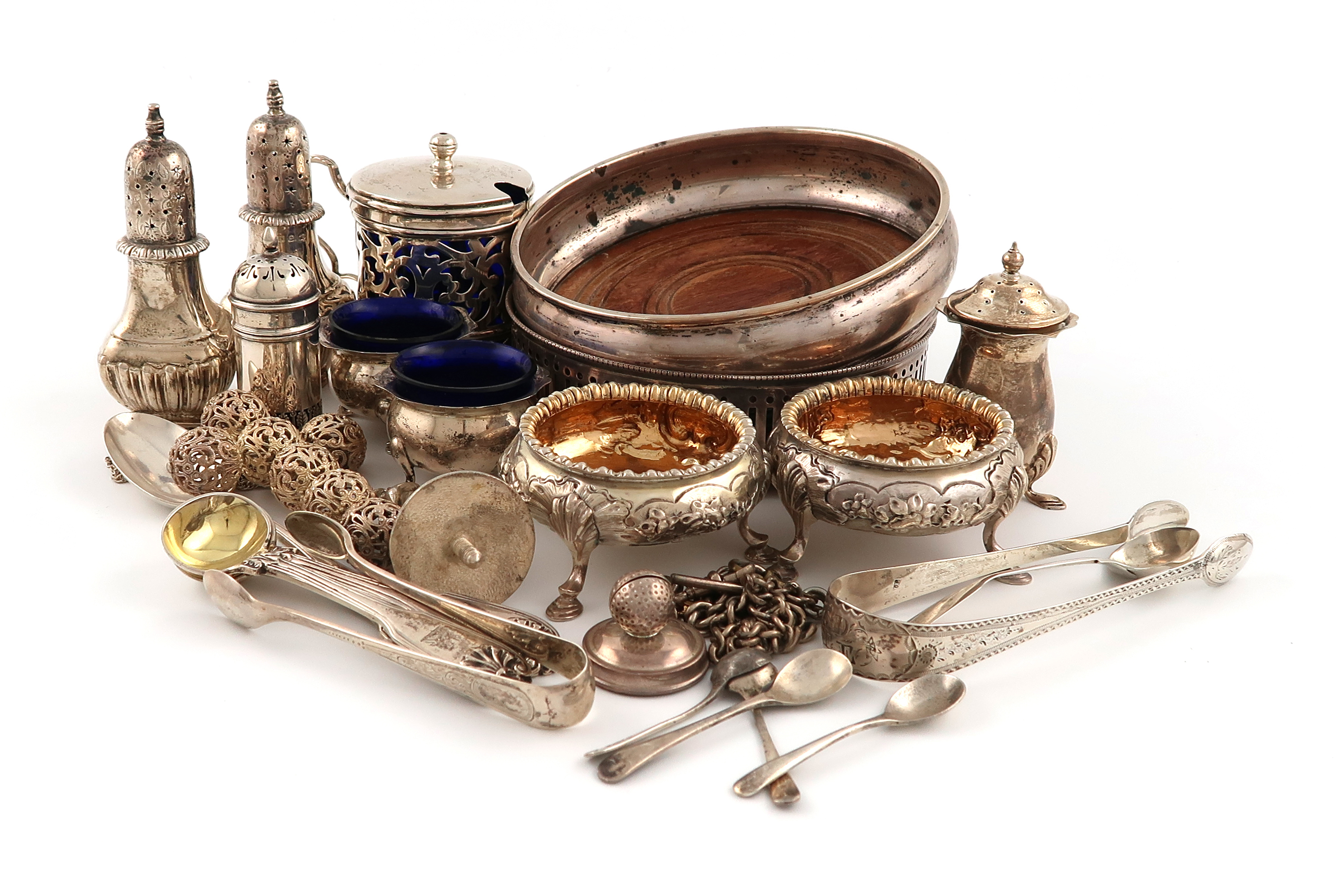 comprising: a mustard pot of circular form, pierced foliate scroll decoration, blue glass liner, by William Hutton and Sons, London 1900, a pair of Victorian salt cellars, London 1844, a modern wine coaster, a pair of pepper pots, a pair of salt cellars, a golf spoon, a pair of salt spoons, five further condiment spoons, a chain, a menu card holder modelled as a golf ball, a filigree cross, and an electroplated wine coaster and golf finial, approx. weighable 19.7oz. (qty).