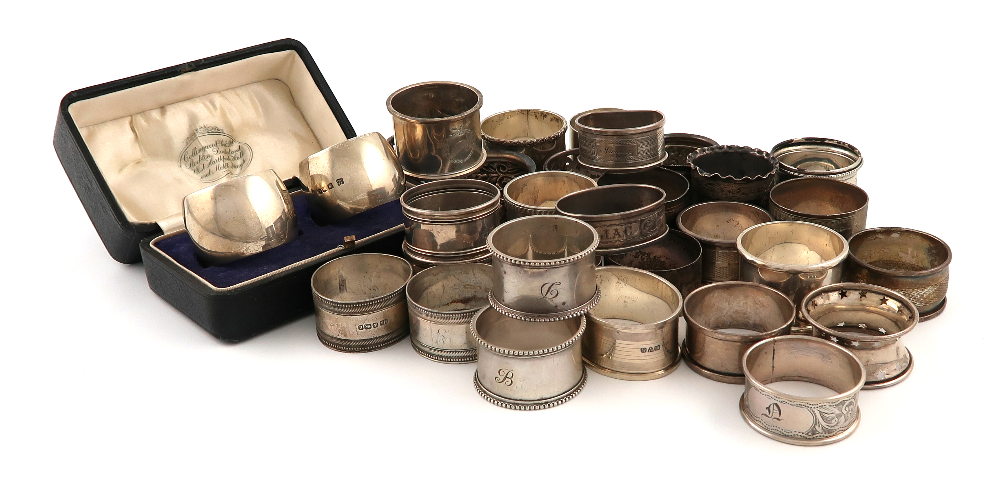 including: a cased pair by Martin, Hall and Co, Sheffield 1922, one with the badge of The British Bull Dog Club, engraved 'Southampton 1908, Little Flutter', plus twenty-eight various others, with plain engine-turned and foliate decoration, approx. weight 25oz. (31)