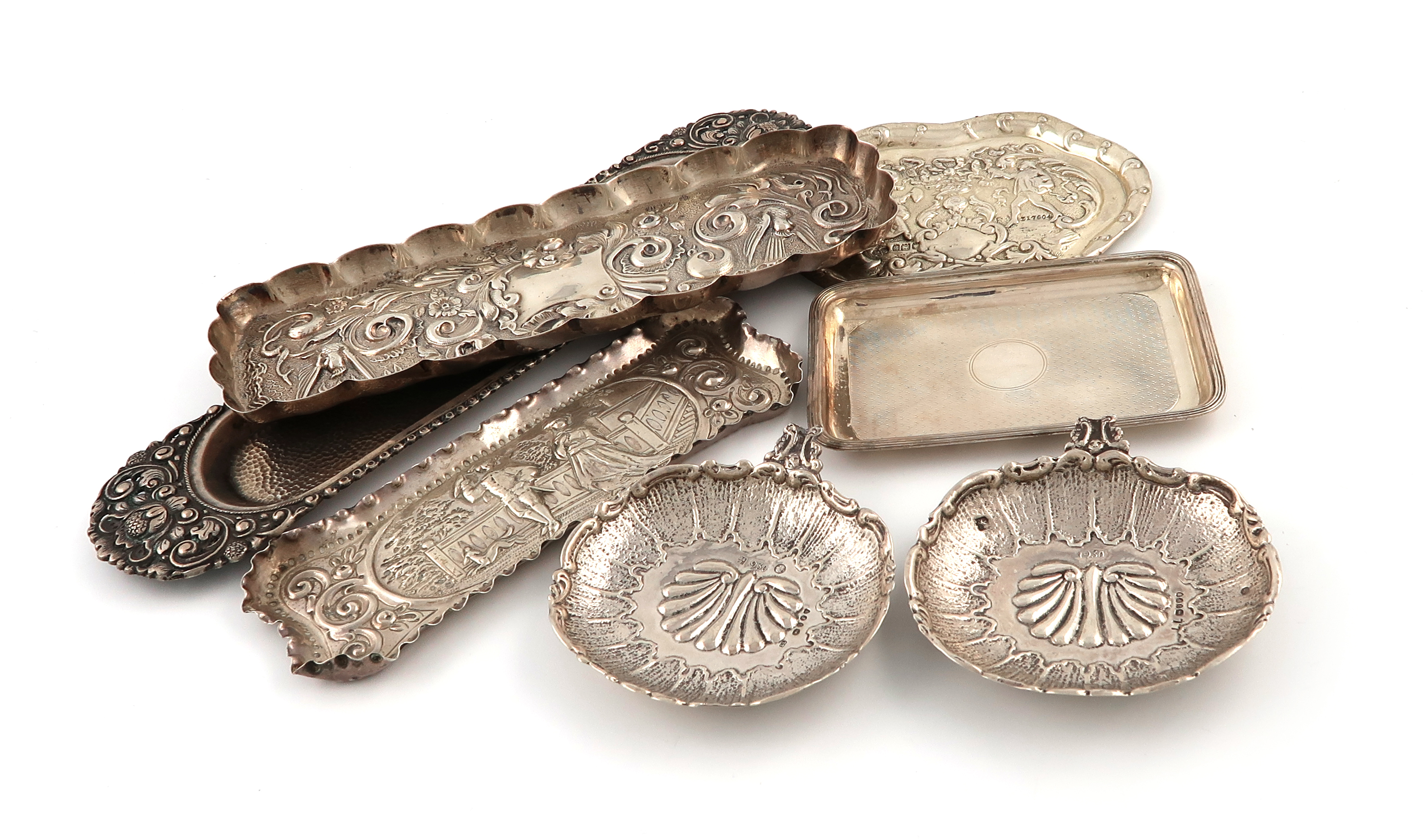 comprising: one by Gibson and Langman, London 1896, embossed with scrolls and birds, one embossed with figures, an engine-turned one, a pair with shell decoration, another one and an .800 standard pen tray, approx. weighable 8.6oz. (7)