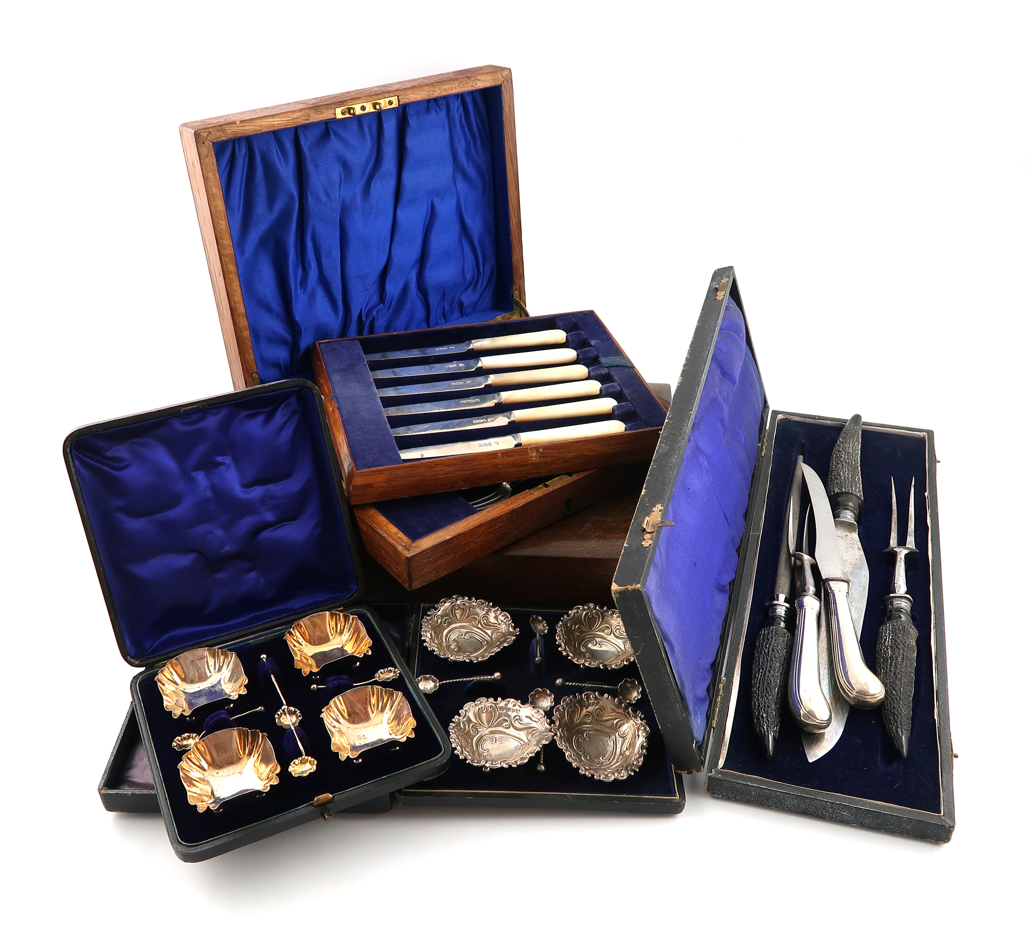 comprising silver items: a set of six fruit knives and forks, by William Hutton and Sons, Sheffield 1926, in a wooden case, a set of twelve silver-handled Kings pattern fruit knives and forks, plated blades and tines, in a wooden case, a set of four Victorian salt cellars and spoons, Birmingham 1897, another set of four with spoons, a pistol-grip handled carving knife and fork, and three-piece antler-handled carving set, with electroplated mounts. (qty)