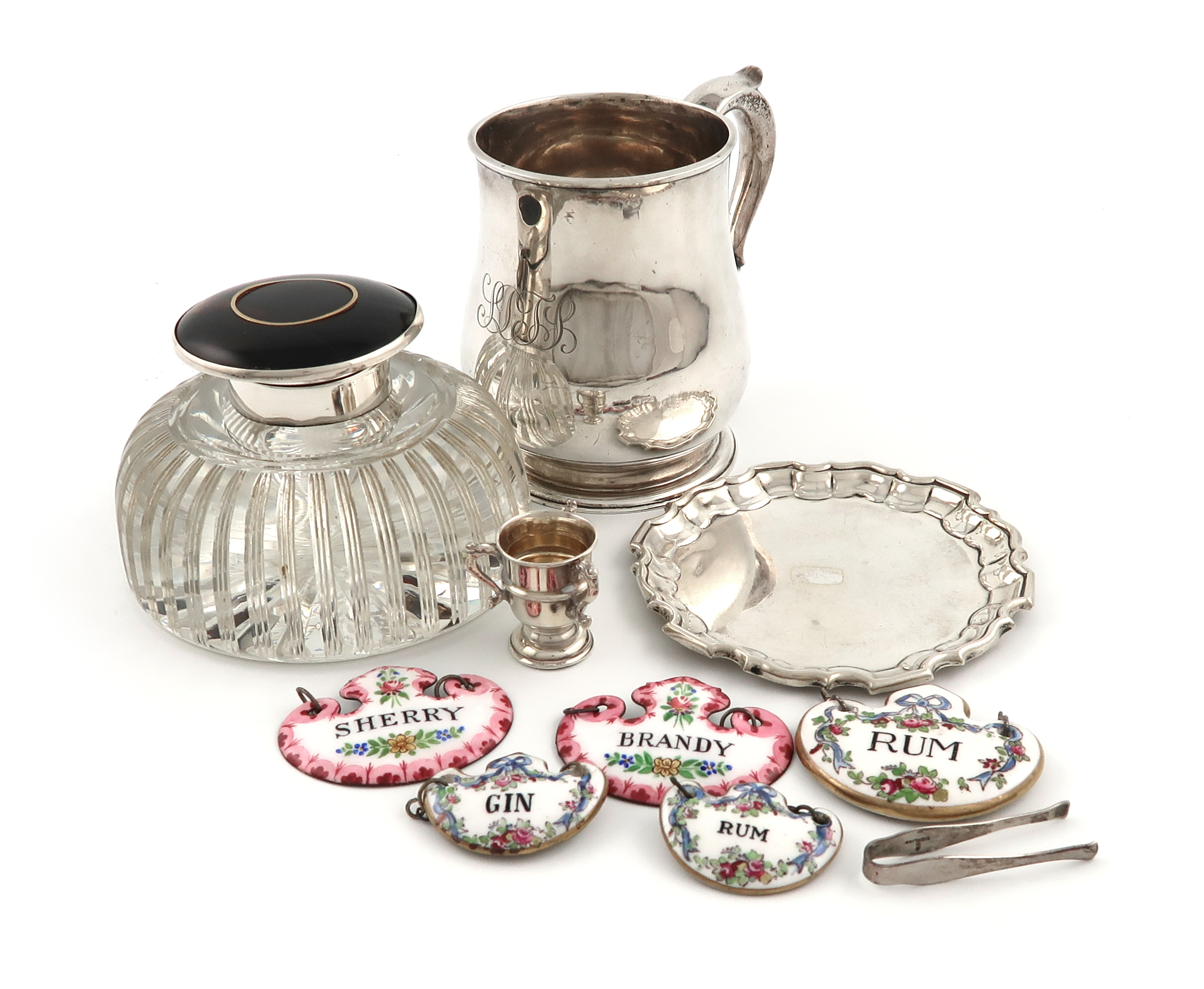 comprising silver items: a mug, by The Goldsmiths and Silversmiths Company, London 1919, baluster form, scroll handle, plus a silver and tortoiseshell mounted glass inkwell, a miniature salver, pair of sugar tongs, a trophy cup, plus two enamelled wine labels and three ceramic wine labels, approx. weighable 11oz. (9)