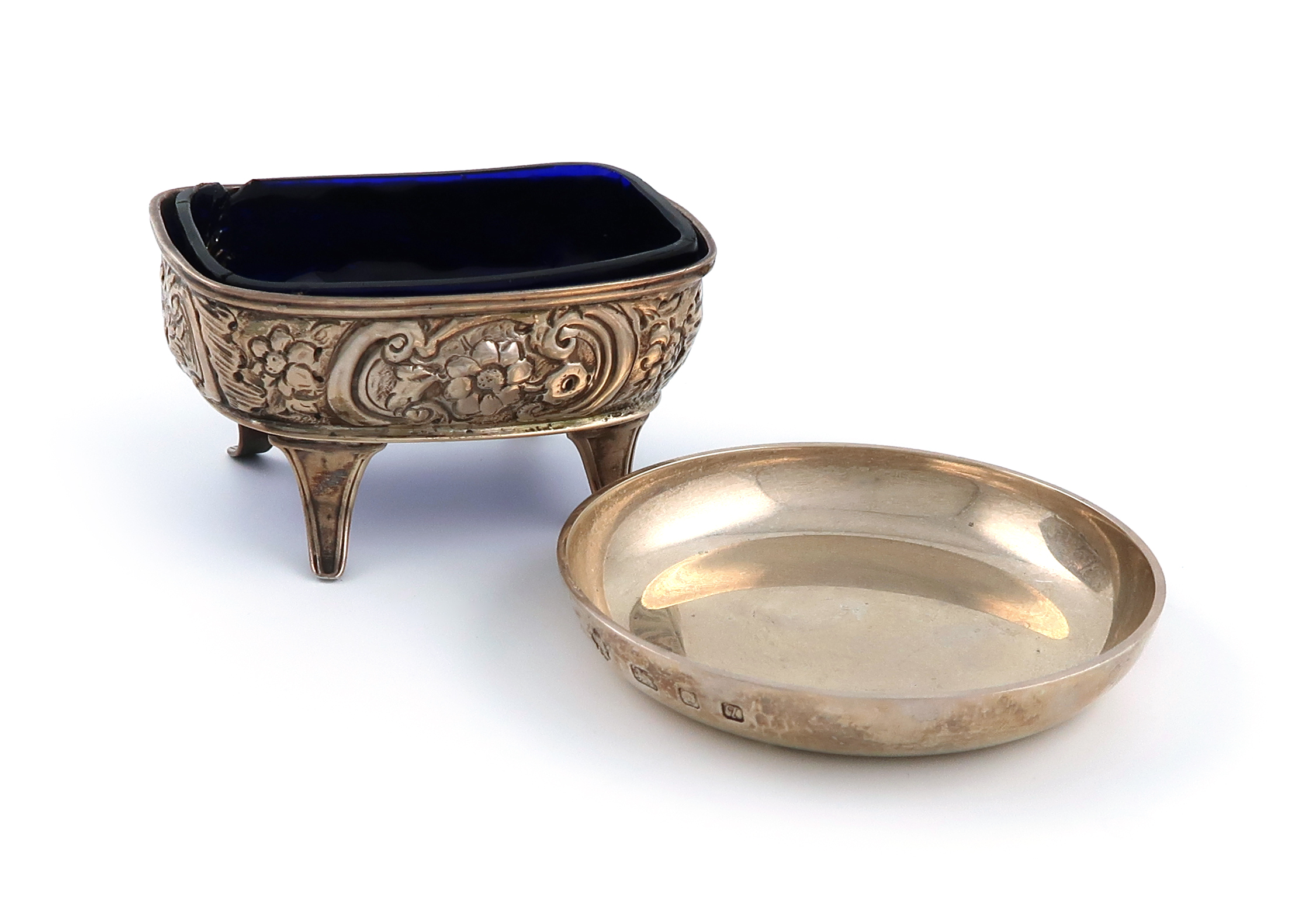 plain circular form, plus a George III provincial silver salt cellar, by Ann Robertson, Newcastle circa 1810, rounded rectangular form, embossed foliate scroll decoration, blue glass liner, on four bracket feet, approx. weight 6oz. (2)