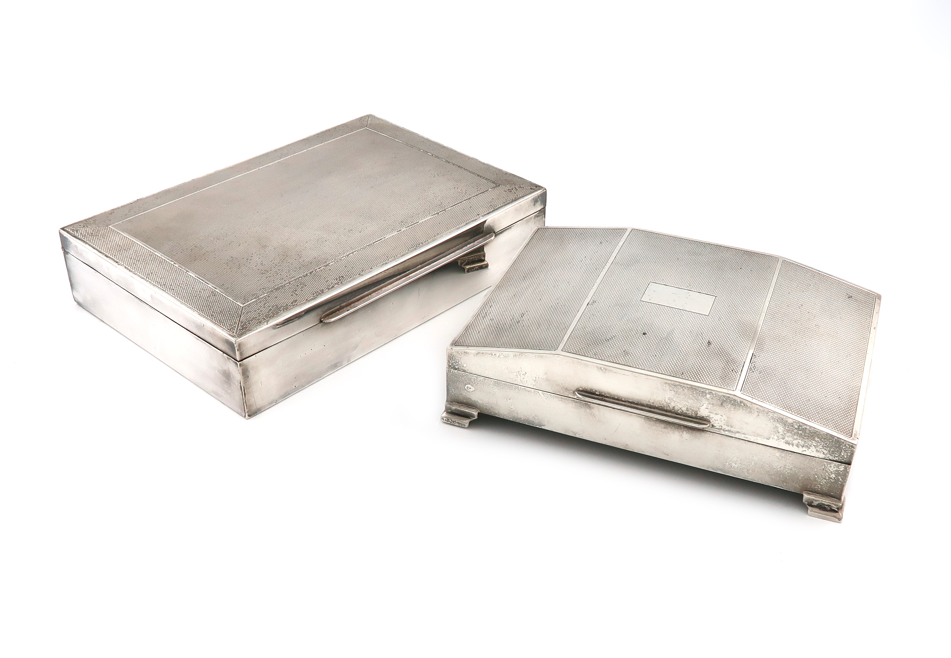 rectangular form, slanted cover with engine-turned decoration, with a vacant cartouche, on four bracket feet, plus a German silver cigarette box, of rectangular form, engine-turned decoration. (2)