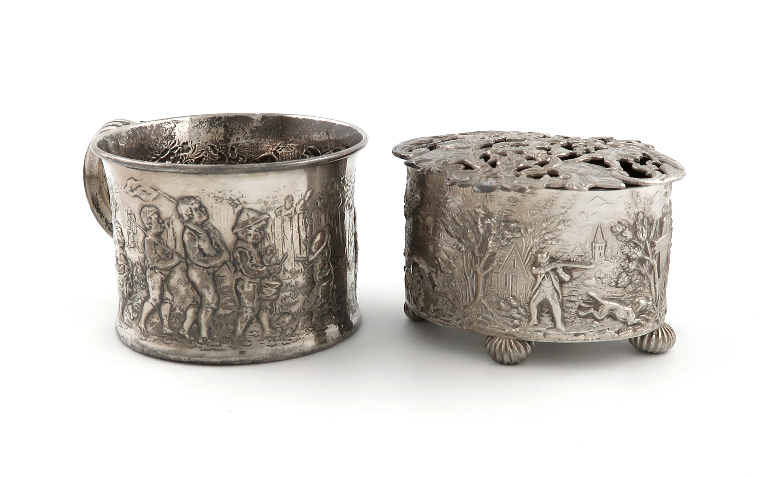 oval form, embossed decoration, the hinged cover pierced with two figures and foliate scroll decoration, on four fluted bun feet, length 8.8cm, plus a silver christening mug, with import marks for Birmingham 1905, importer's mark of The Gorham Manufacturing Company, embossed with children, approx. total weight 6.9oz. (2)
