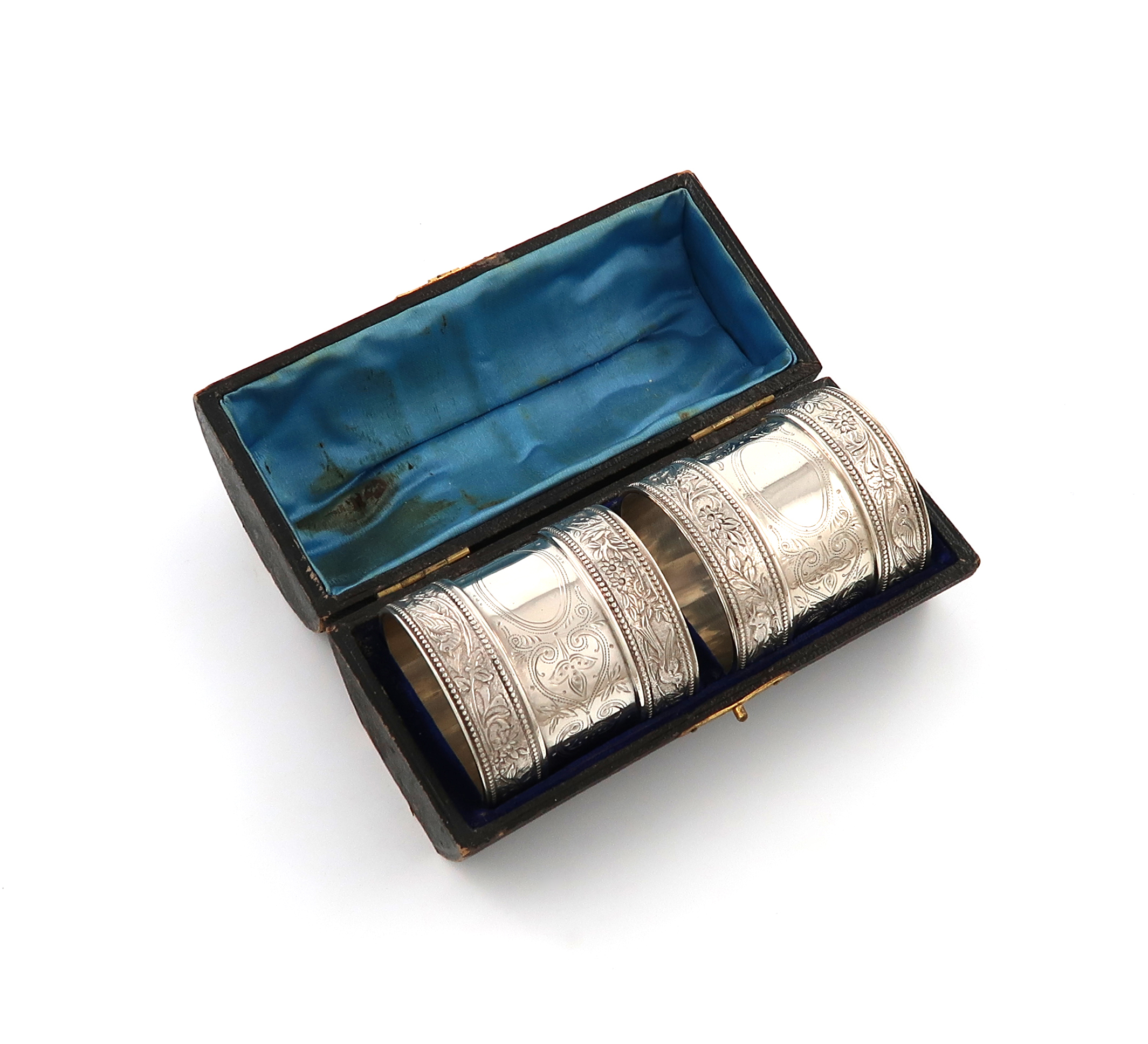 circular form, chased and engraved with birds and foliate decoration, in a fitted case, length 4.8cm, approx. weight 4.8oz. (2)