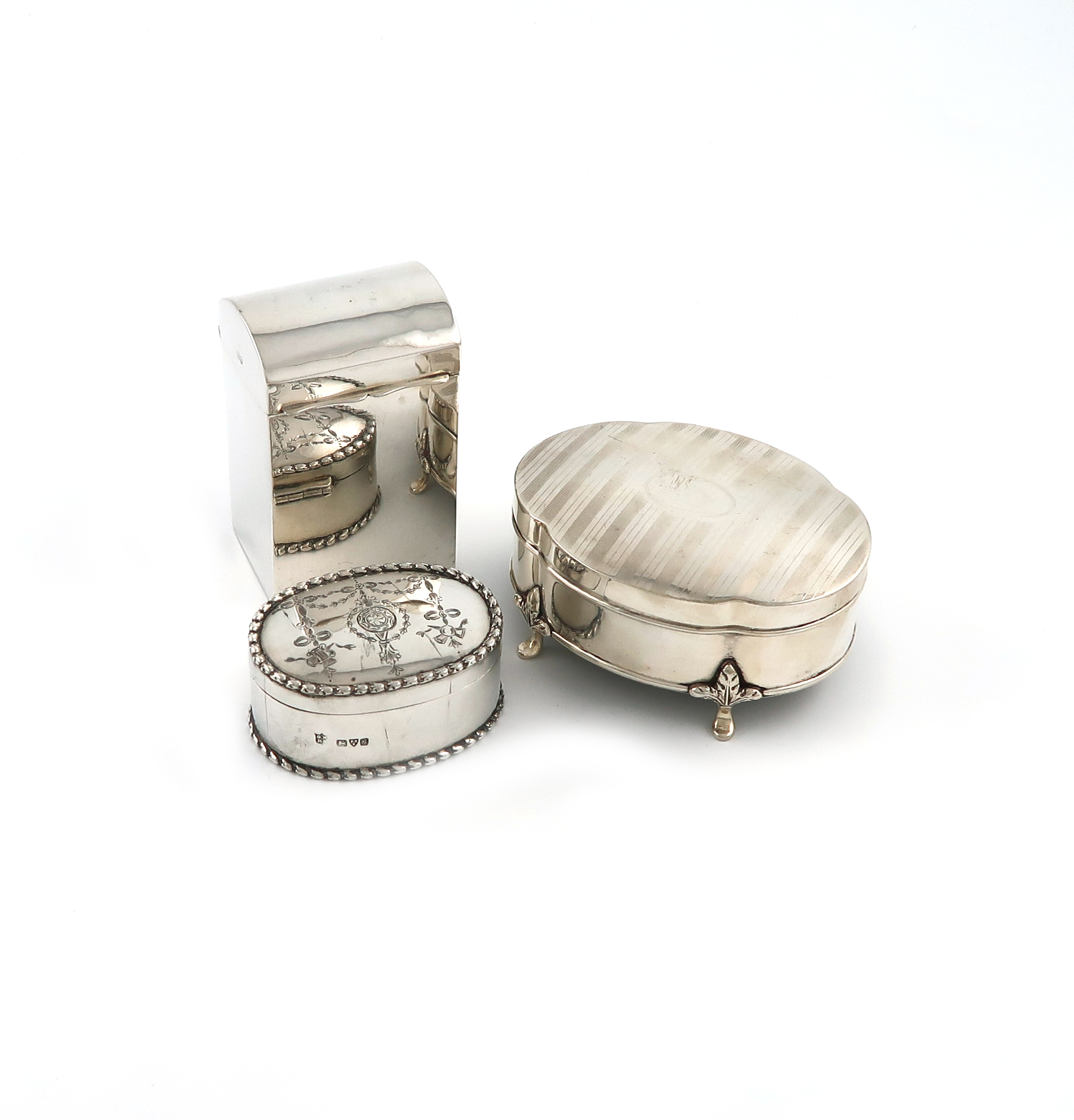 comprising: a playing cards box, of upright rectangular form, domed cover, by Nathan and Hayes, Chester 1901, plus a dressing table box, Chester 1912, lobed oval form, engine-turned decoration, and another oval dressing table box, the cover with engraved decoration, by Nathan and Hayes, Chester 1907, approx. weighable 4.9oz. (3)