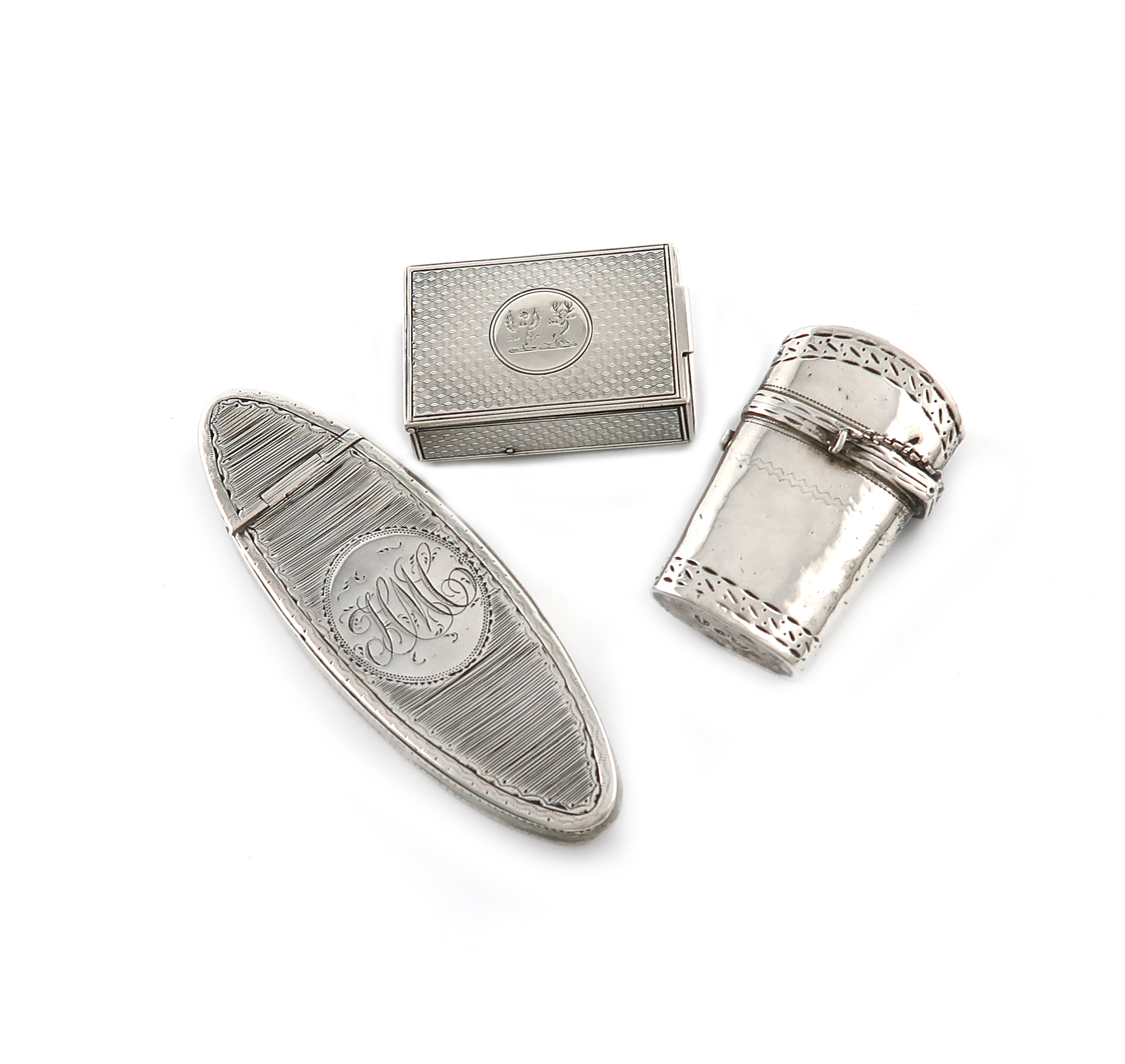 comprising: a Victorian snuff box, by Thomas Dee, London 1864, retailed by Asprey, rectangular form, engine-turned decoration, hinged cover with two crests, sprung hinged base, plus a George III toothpick box, of oval navette form, and a silver scent bottle case / etui case, by Samuel Pemberton, Birmingham 1798, approx. weight 2.5oz. (3)