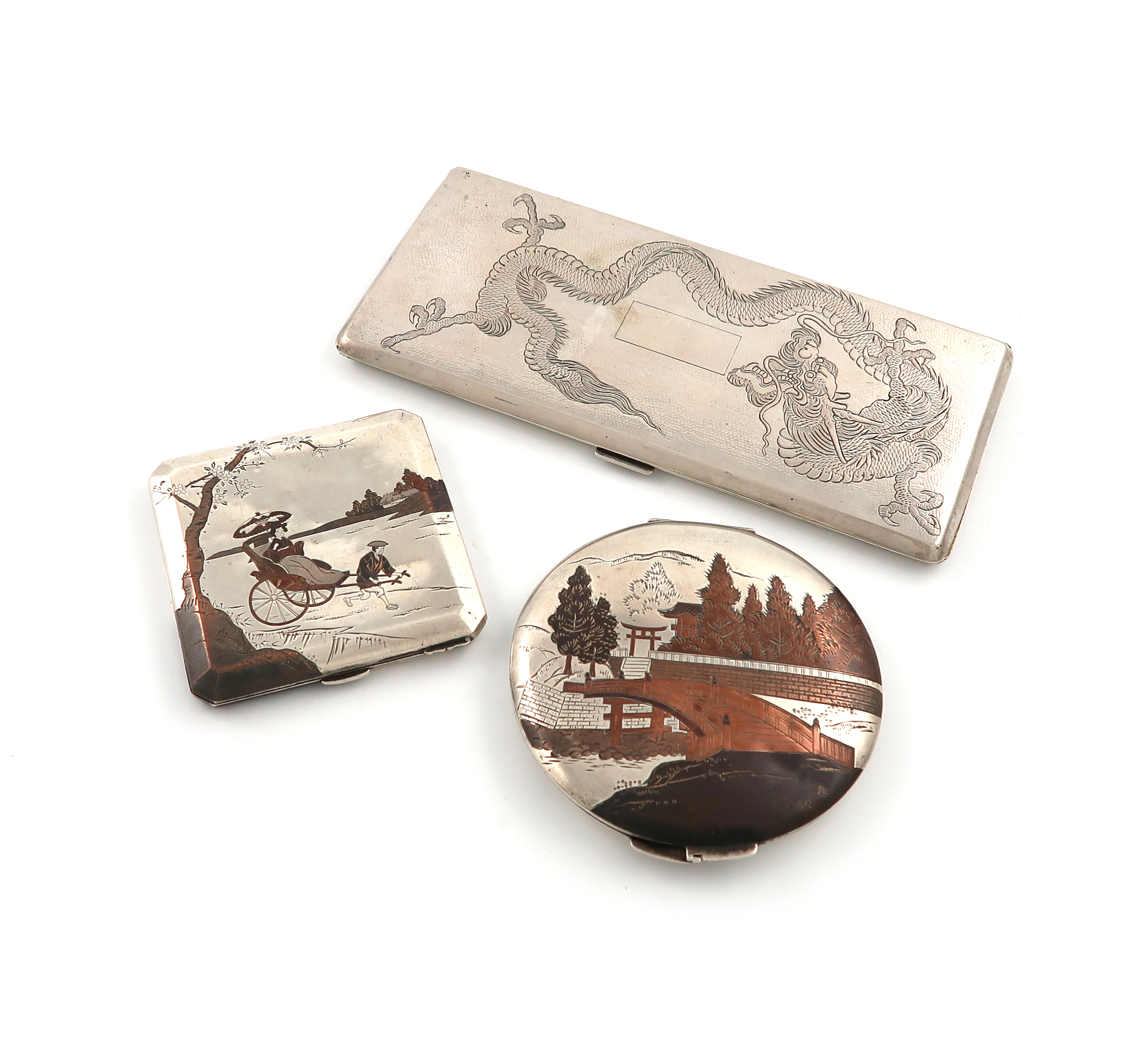 the cigarette case of rectangular form, with a scene of a lady being carried in a rickshaw, the circular compact with a bridge and landscape scene, plus a Japanese silver cigarette case of rectangular form, chased with a dragon on a matted background, approx. total weight 13.9oz. (3)