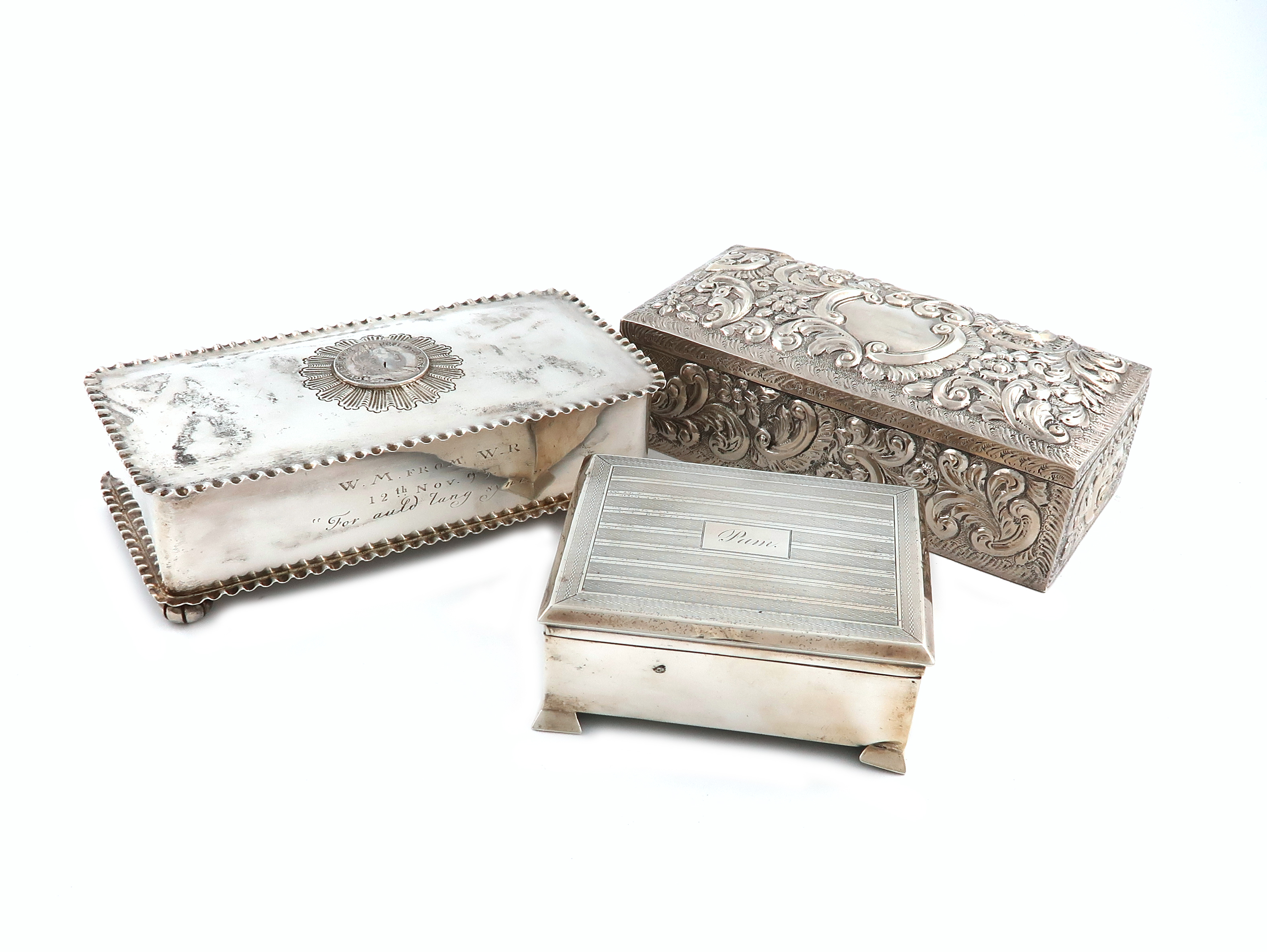 rectangular form, crimped border, the cover set with a coin, the front inscribed, on four bun feet, length 18.5cm, plus a Victorian silver cigarette box, of rectangular form, embossed foliate scroll decoration, Birmingham 1894, cedar lined, and another cigarette box, approx. weighable 13.7oz. (3)