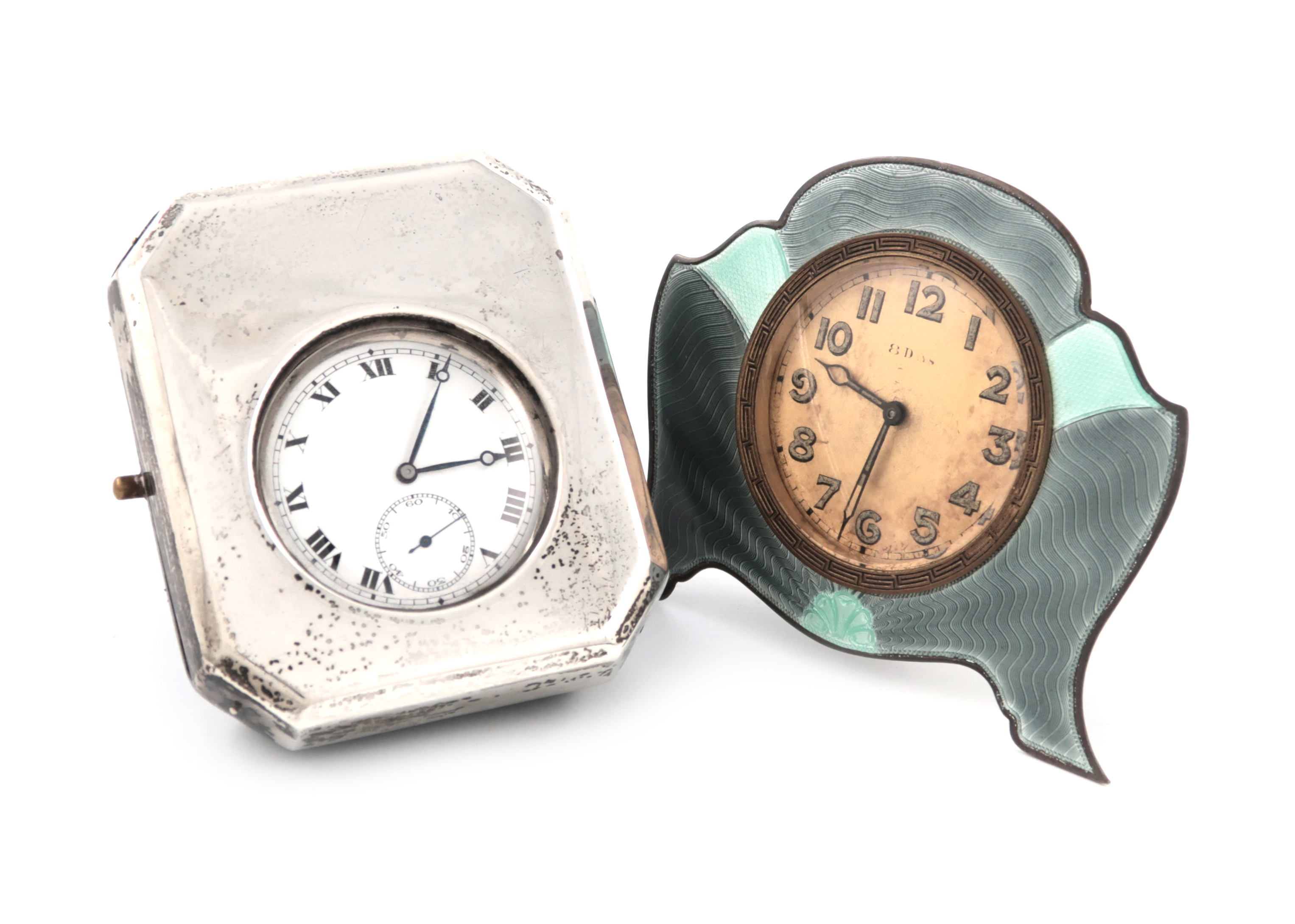 arched rectangular form, gilt-metal back and easel strut, length 9.7cm, plus a silver travelling watch case and pocket watch, the case London 1919, inscribed. (2)