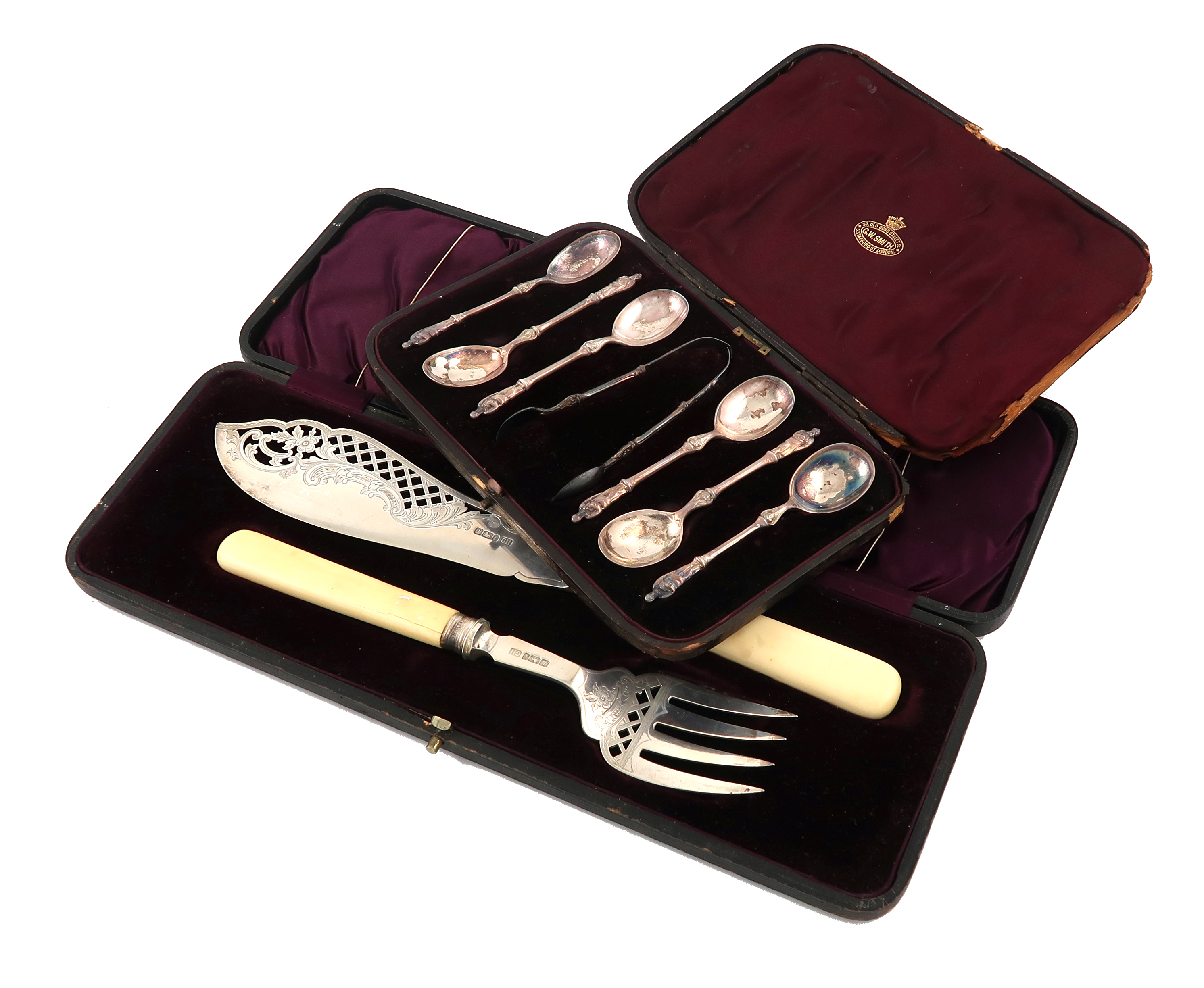 the blades with pierced and engraved decoration, ivory handles, in a fitted case, plus a set of six Victorian Apostle teaspoons and tongs, in a fitted case. (2)