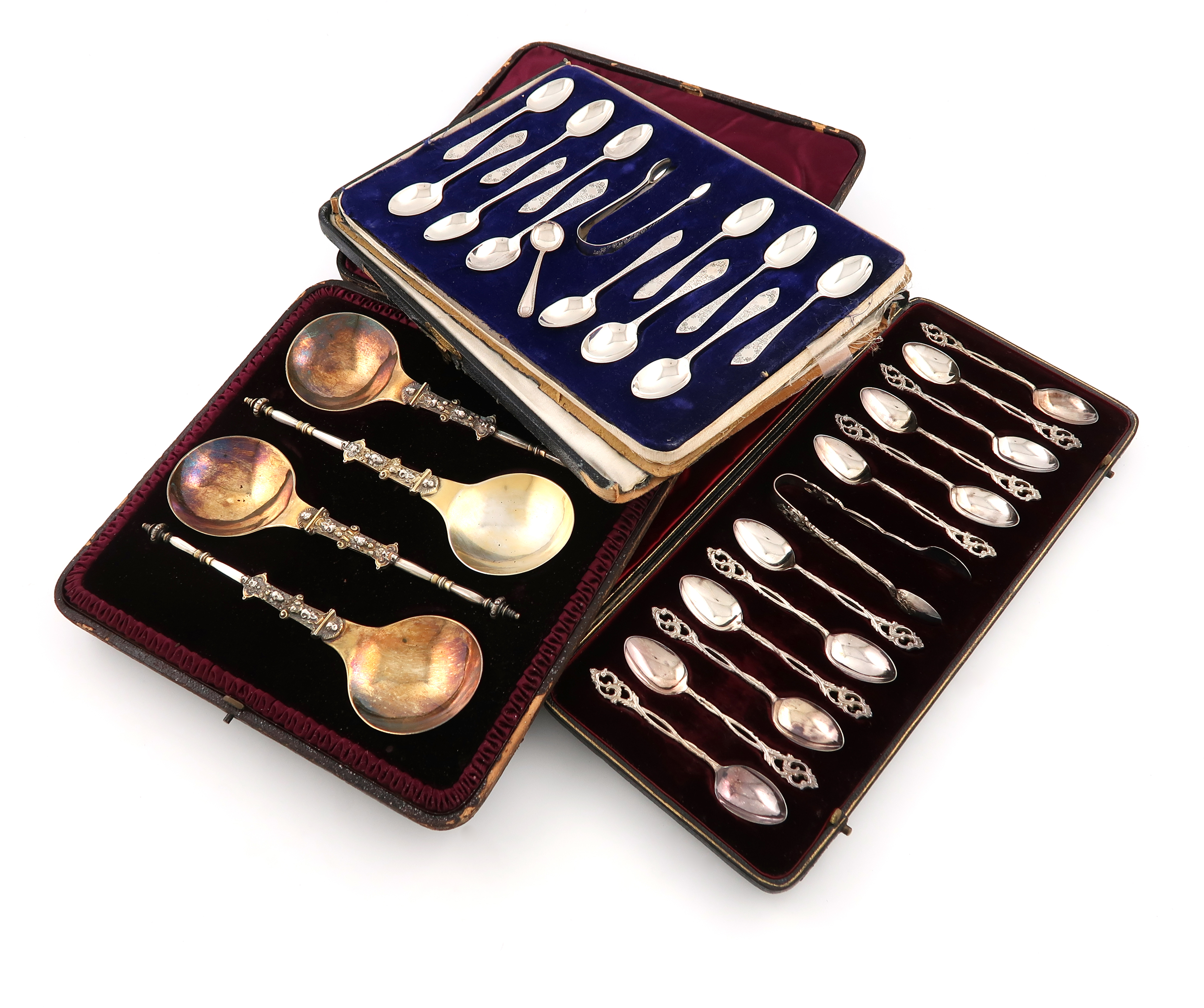 comprising: a set of four Victorian silver-gilt serving spoons, by Sibray, Hall & Co, in the seventeenth century manner, a set of twelve Victorian teaspoons and tongs, by Gibson and Langman, London 1899, pierced scroll terminals, plus a set of twelve Irish teaspoons, by West and Son, Dublin 1923, case a.f, approx. weighable 20oz. (3)