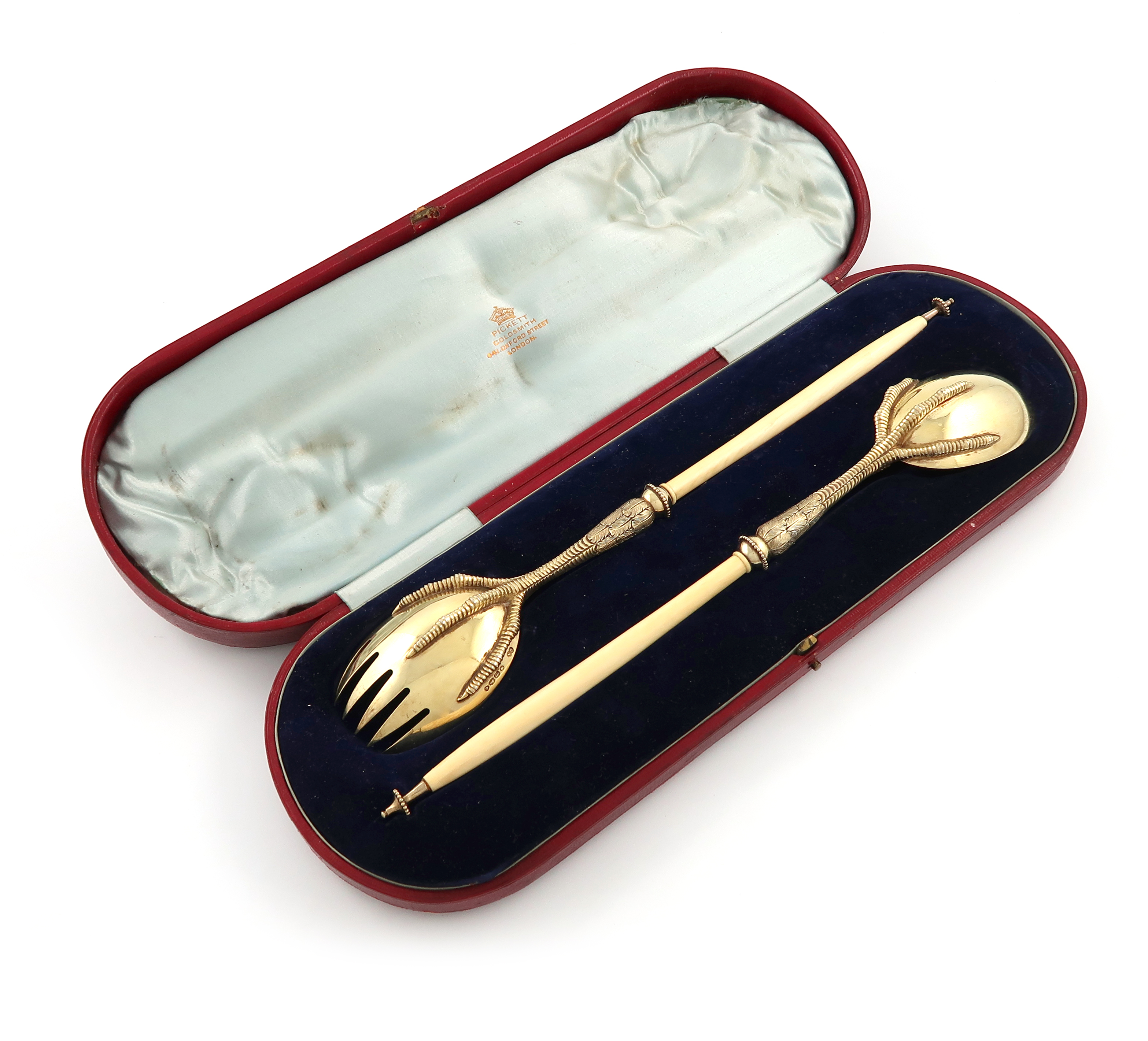 λA pair of Victorian silver-gilt and ivory salad servers,