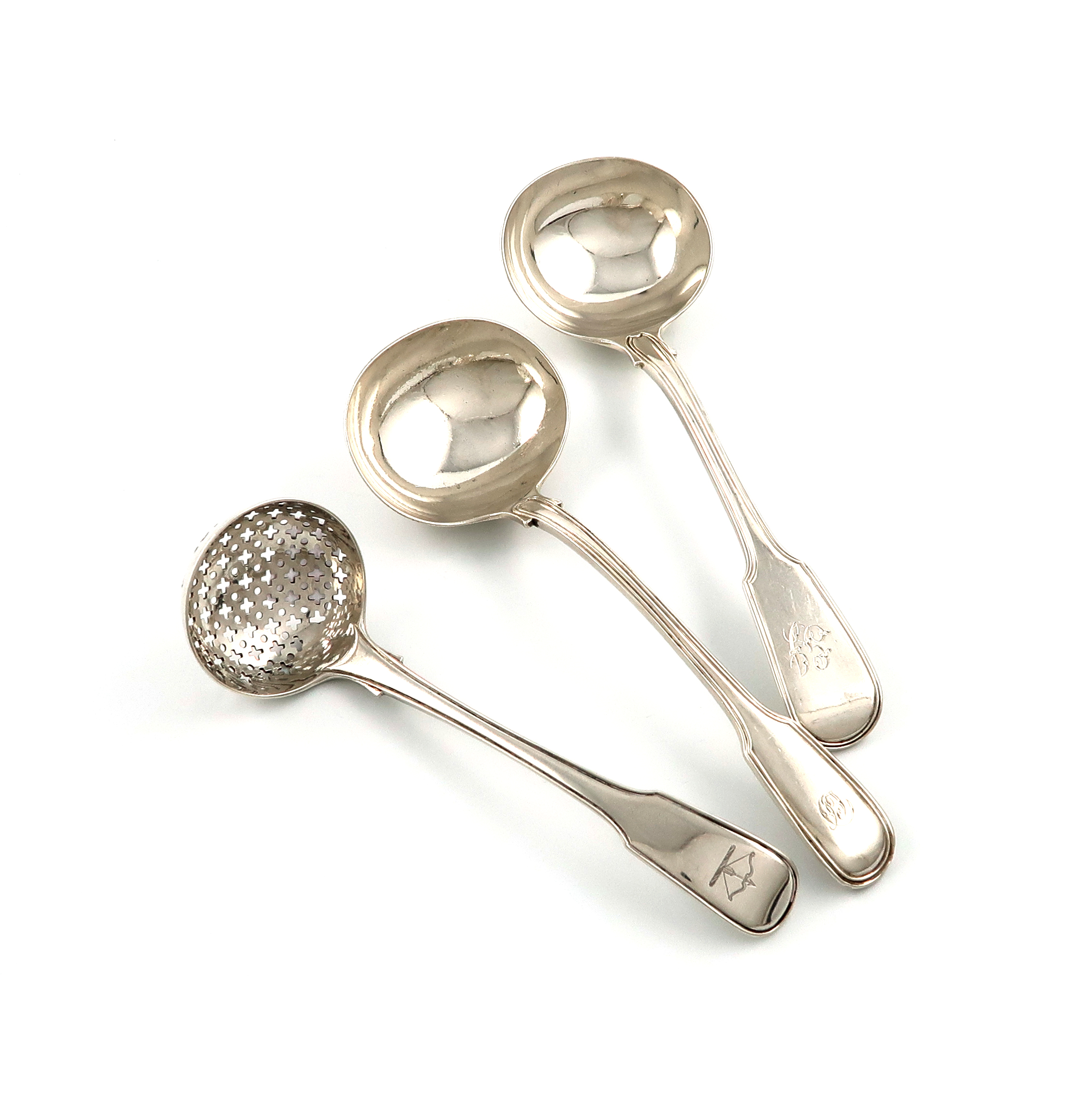 the terminals with a crest, plus two silver Fiddle and Thread pattern sauce ladles, London 1820, by Eley and Fearn, and London 1836, by Theobalds and Bunn, approx. weight 6.5oz. (3)