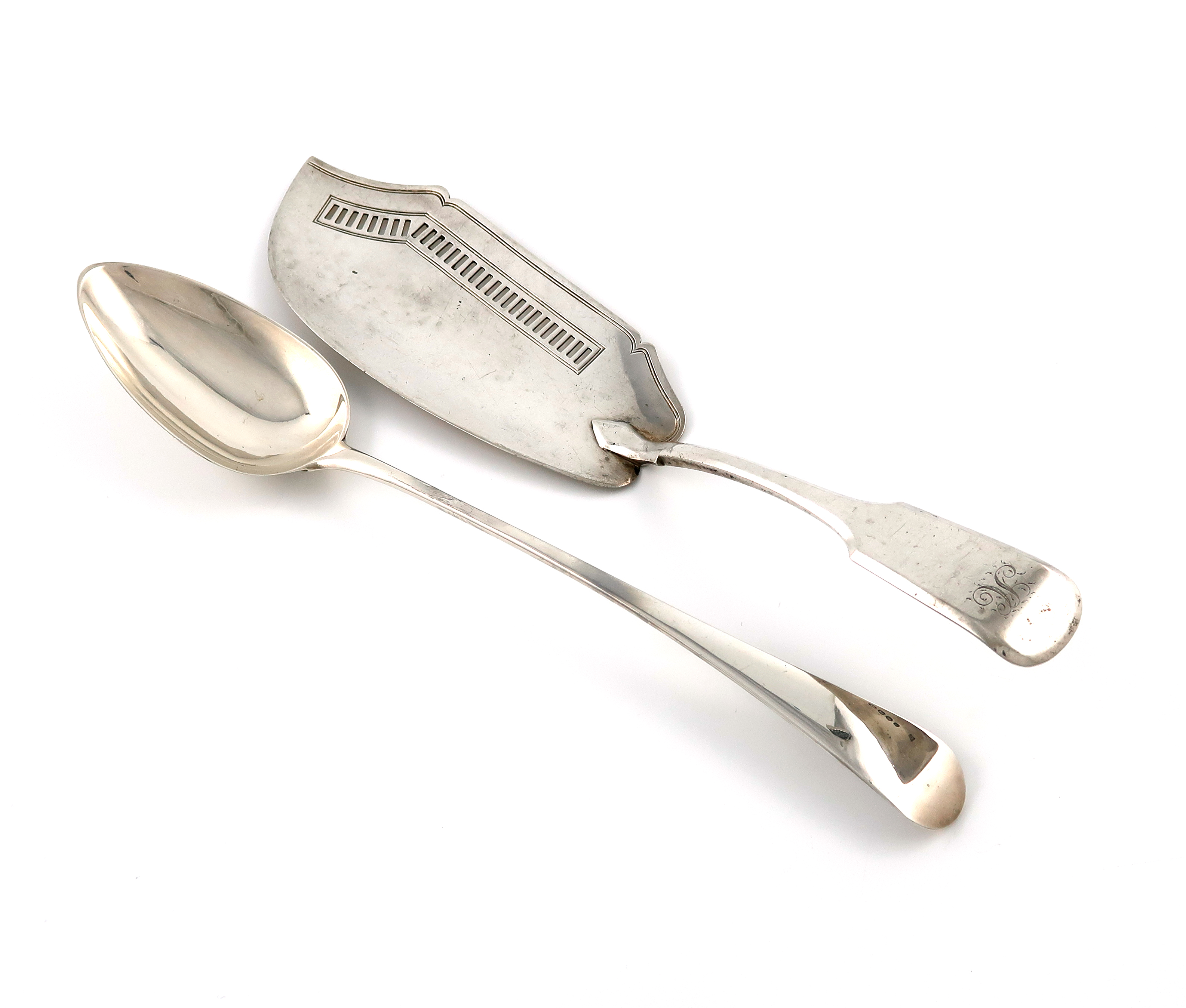 plain terminal, plus a George III silver Fiddle pattern fish slice, London 1806, the terminal initialled, approx. weight 8oz. (2)