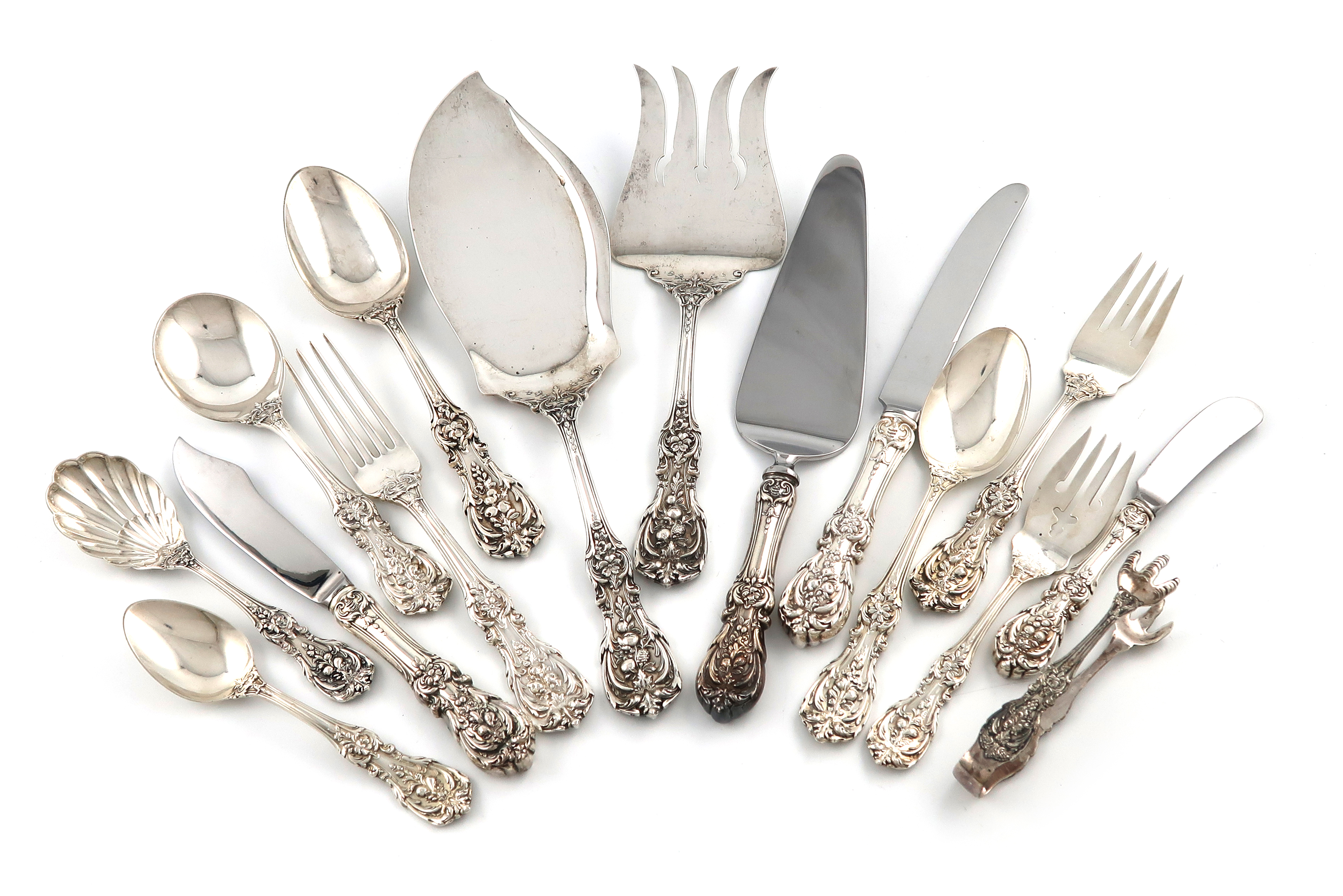 comprising: twelve table forks, twelve table knives, twelve dessert spoons, twelve fish forks, twelve fish knives, (stainless blades), twelve salad forks, twelve soup spoons, twenty-four teaspoons, a pair of fish servers, twelve butter knives, (stainless blades), two tablespoons, a serving slice, a sugar spoon and a pair of sugar tongs, approx. weighable 166oz. (qty)