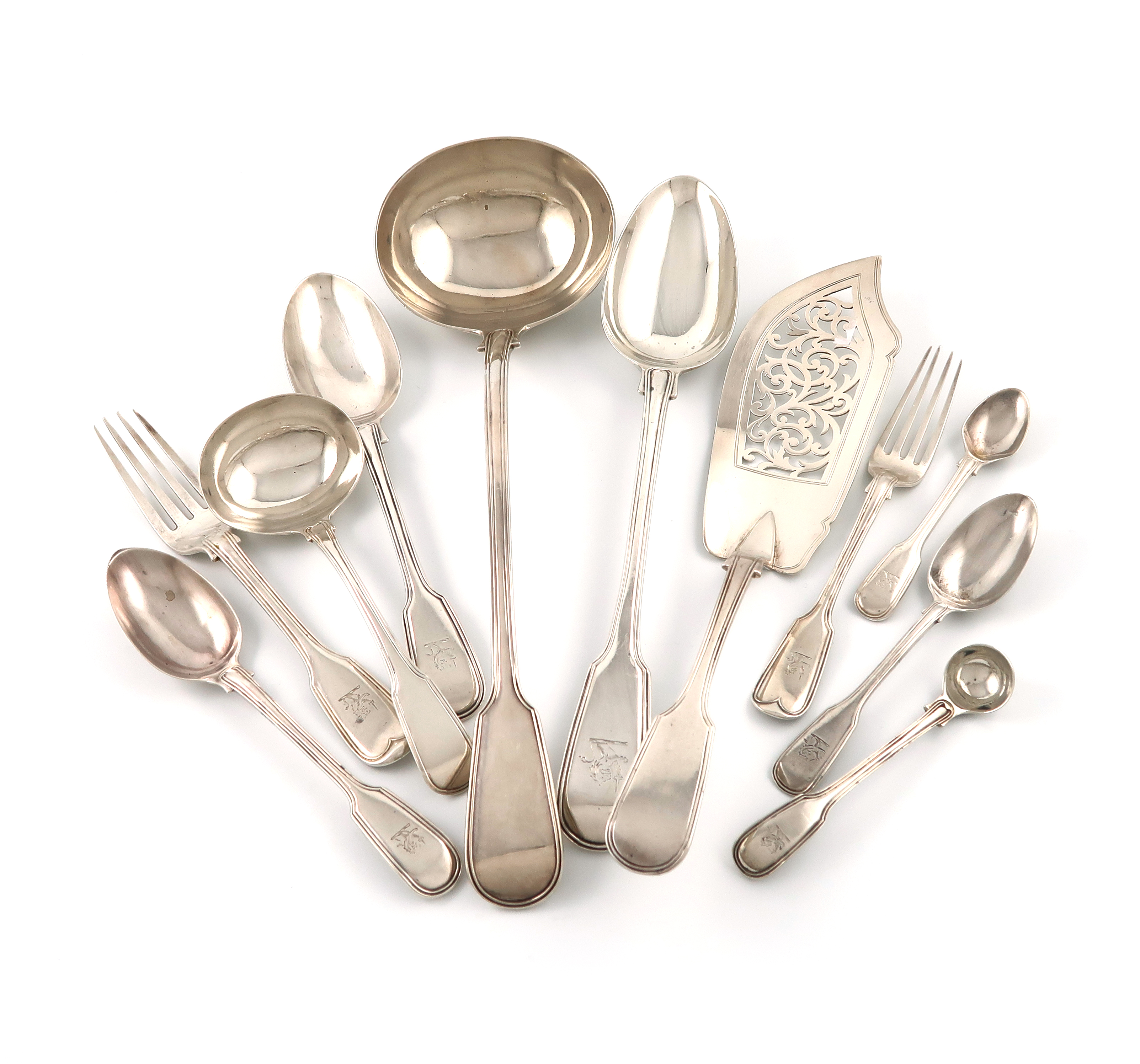 some pieces crested, comprising: a soup ladle, a fish slice, a basting spoon, a pair of sauce ladles, a single sauce ladle, (London 1812), four table spoons, seven dessert forks, seven dessert spoons, five table forks, a condiment ladle, eleven teaspoons, and four egg spoons, approx. weight 92oz. (qty)