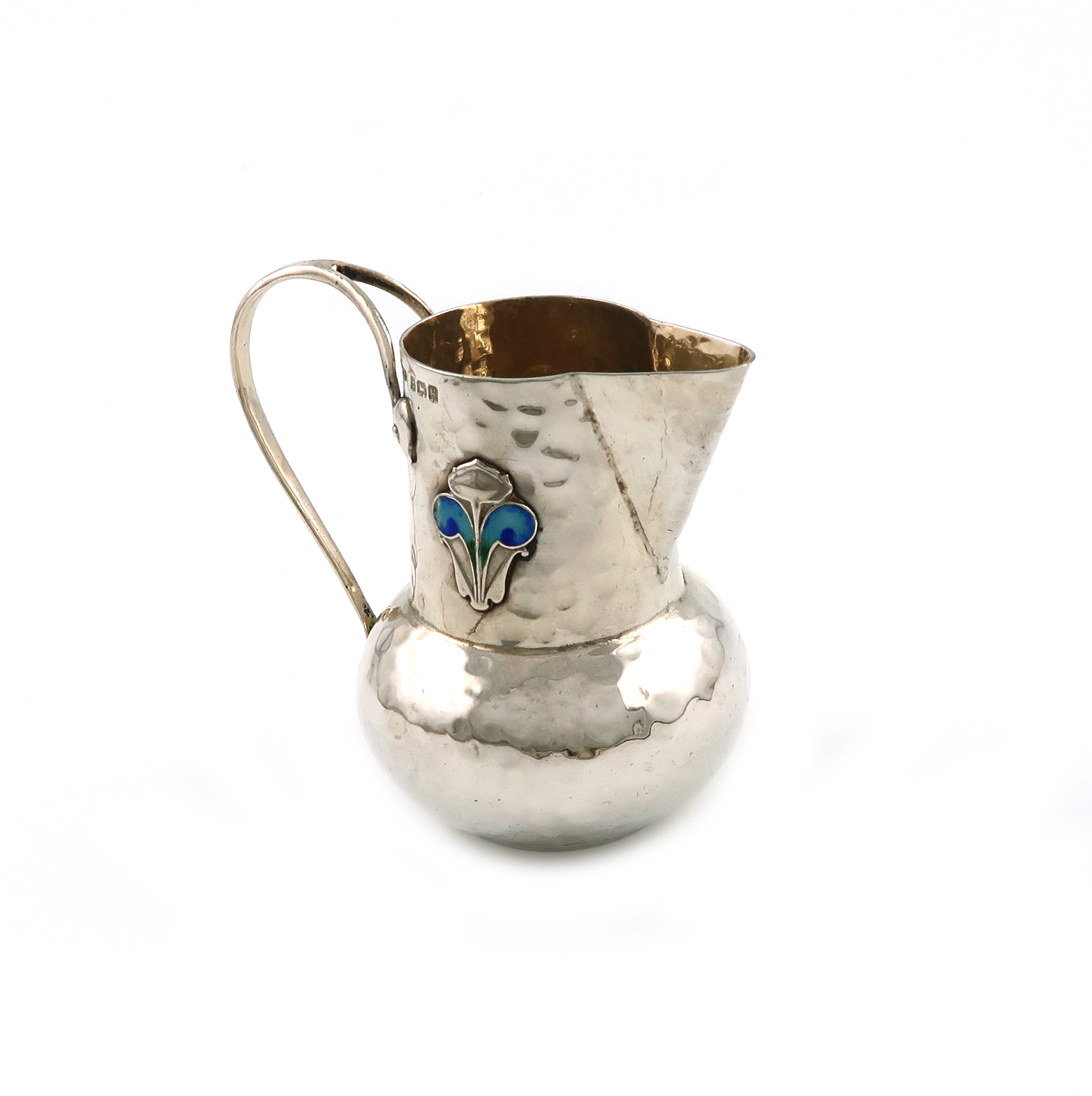 By James Fenton, an Edwardian Arts and Crafts silver and enamel cream jug,