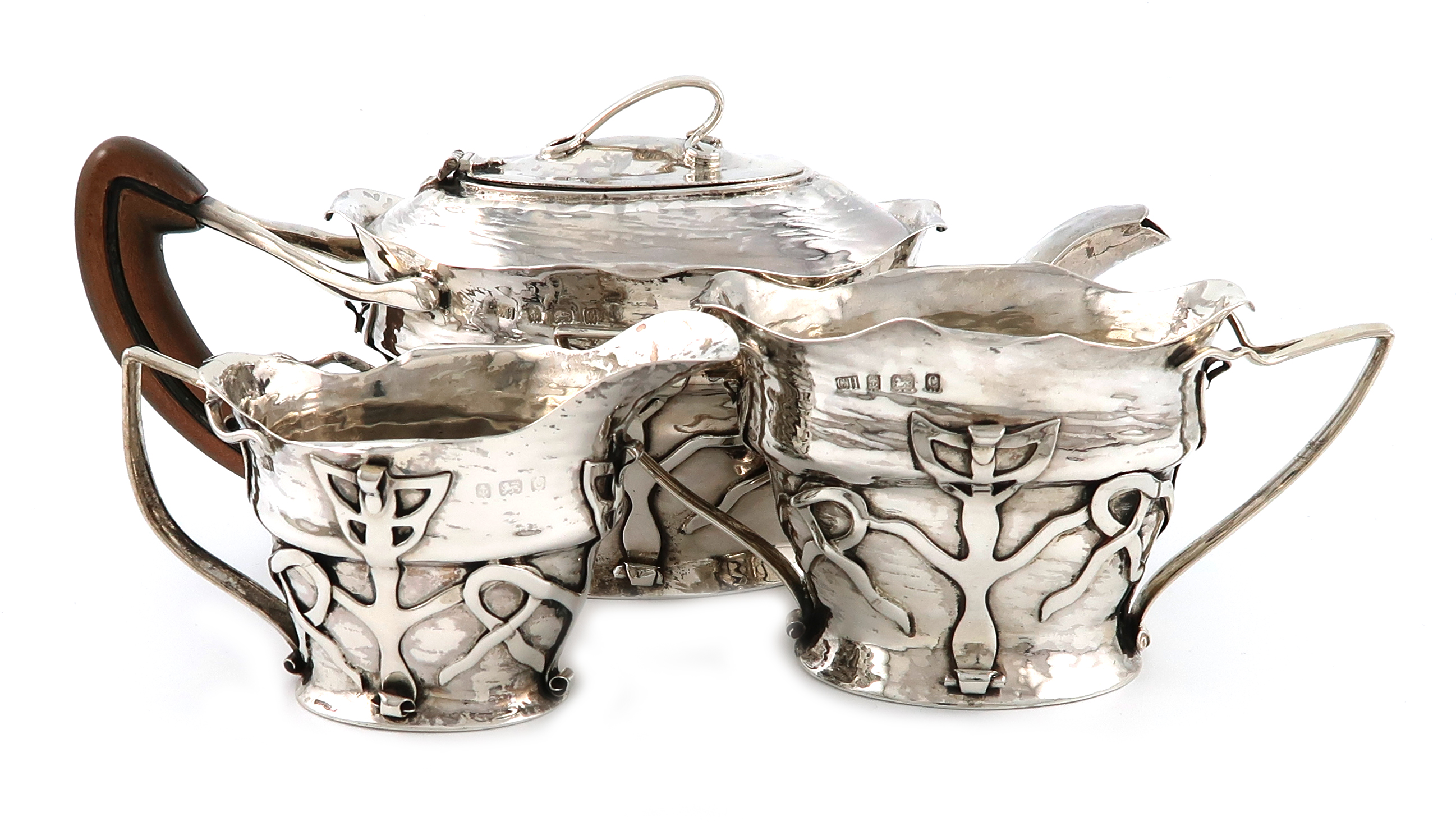 By Charles Harrold and Sons, a three-piece Edwardian Art Nouveau silver tea set,