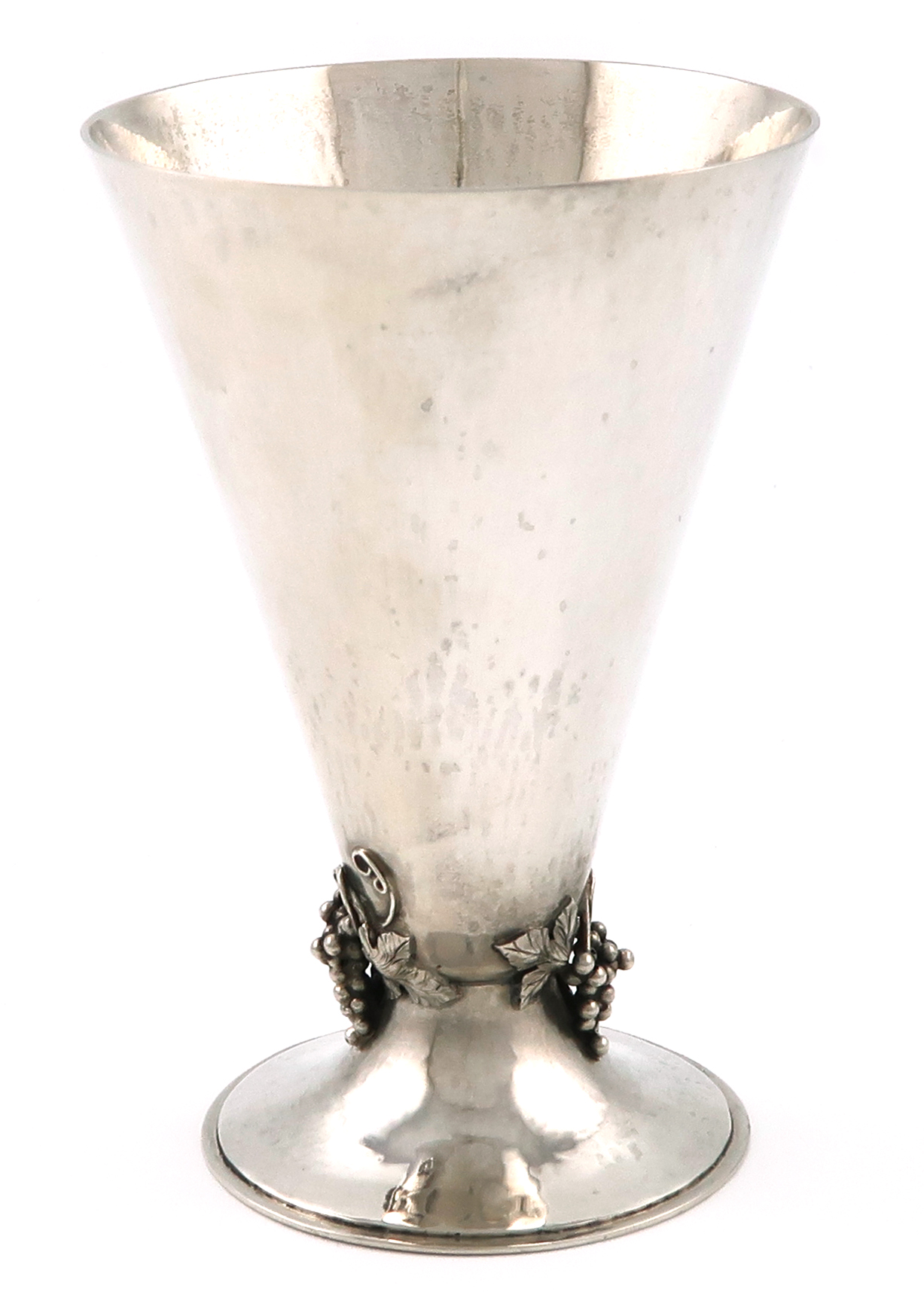tapering conical form, spot-hammered decoration, on a raised circular foot, applied with trailing vines and grapes, height 11.8cm, approx. weight 5oz.