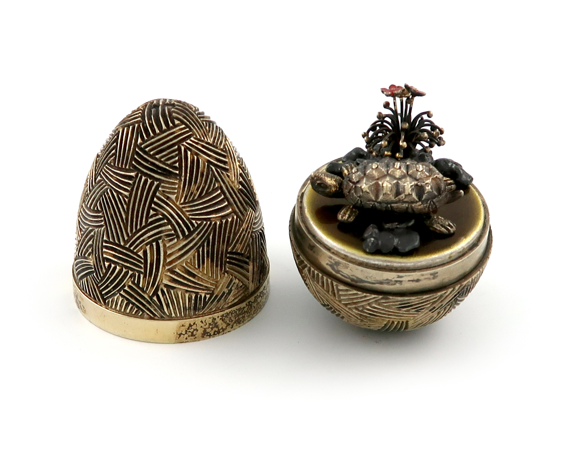 textured decoration, the cover opens to reveal a turtle with foliate and enamel decoration, height 7.4cm.