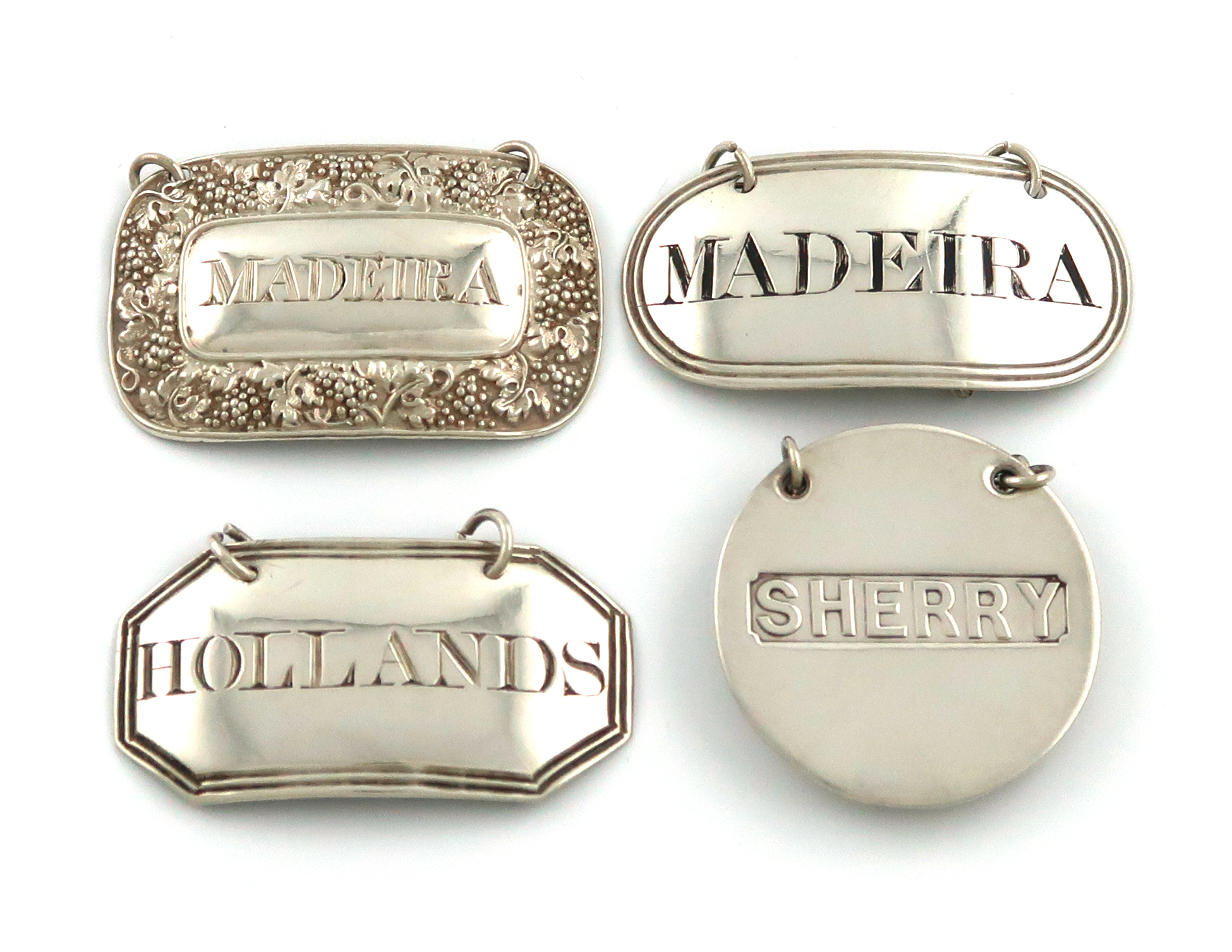comprising: one by James Aldridge, London 1803, incised 'HOLLANDS', another incised and blackened 'MADEIRA', another 'MADEIRA' label, with a vine border, and one by S. Mordan and Co, Chester 1913, stamped 'SHERRY', approx. weight 1.4oz. (4)