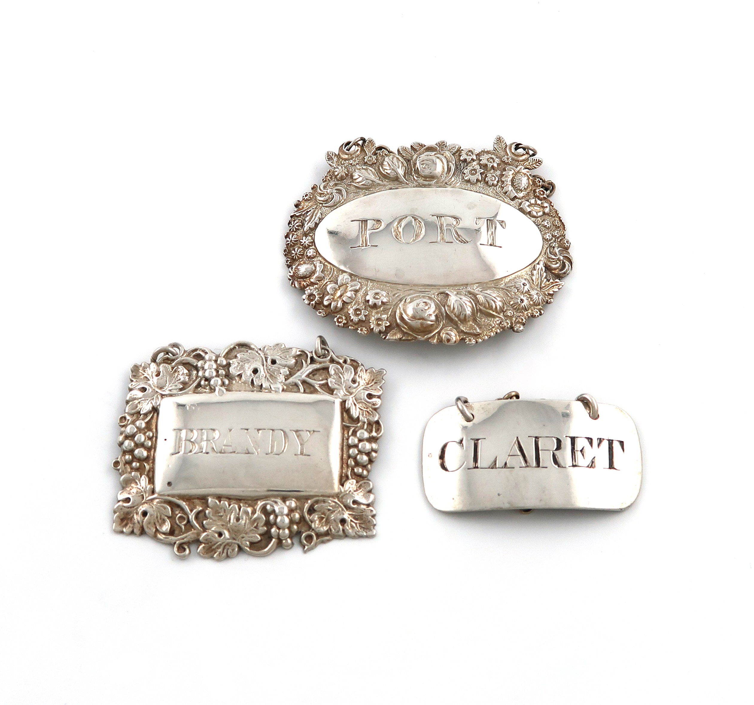 comprising: a George III one incised 'CLARET', London 1802, plus one incised 'BRANDY' and one incised 'PORT', approx. weight 1.1oz.