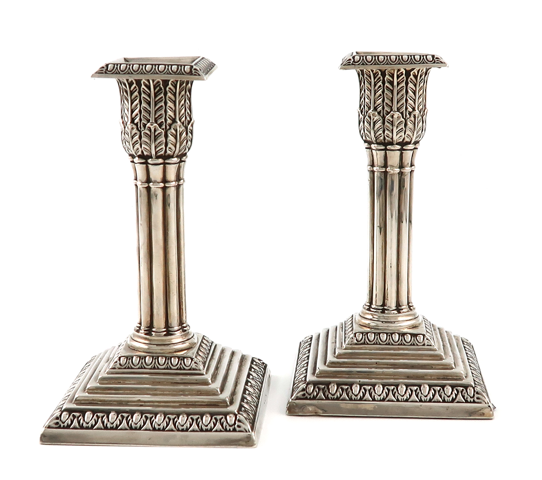 fluted columns, acanthus leaf capitals, on stepped square bases, height 14.5cm. (2)