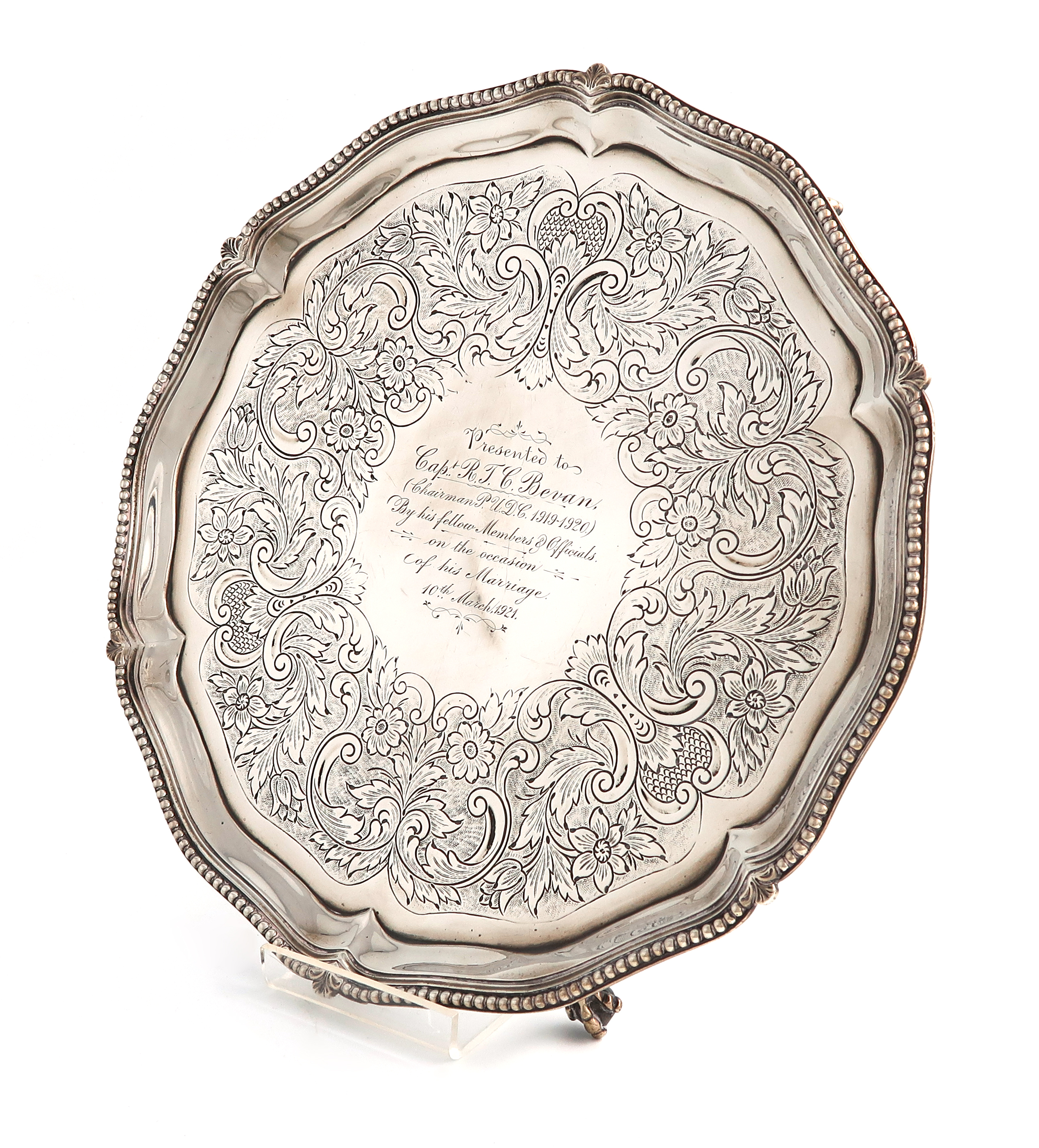 circular form, beaded border, chased foliate decoration, the centre with a later presentation inscription, on three claw and ball feet, diameter 28cm, approx. weight 22.9oz.