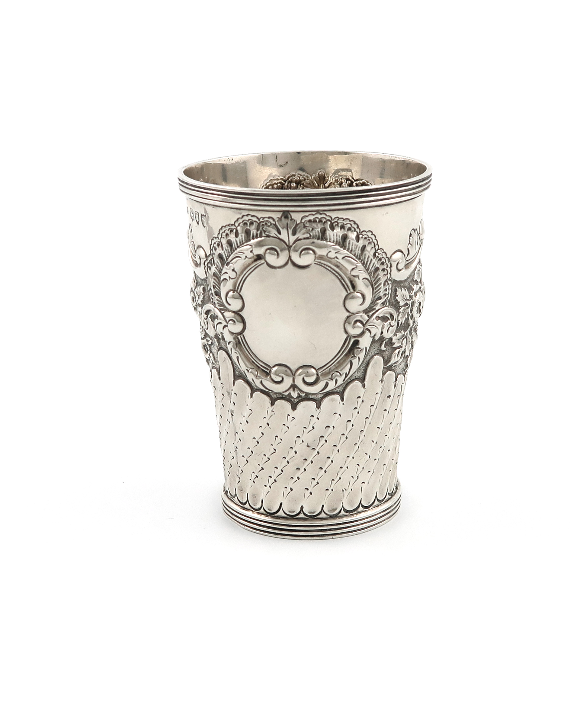 tapering circular form, embossed foliate scroll decoration above part-fluted decoration, vacant cartouche, height 10.5cm, approx. weight 4.4oz.