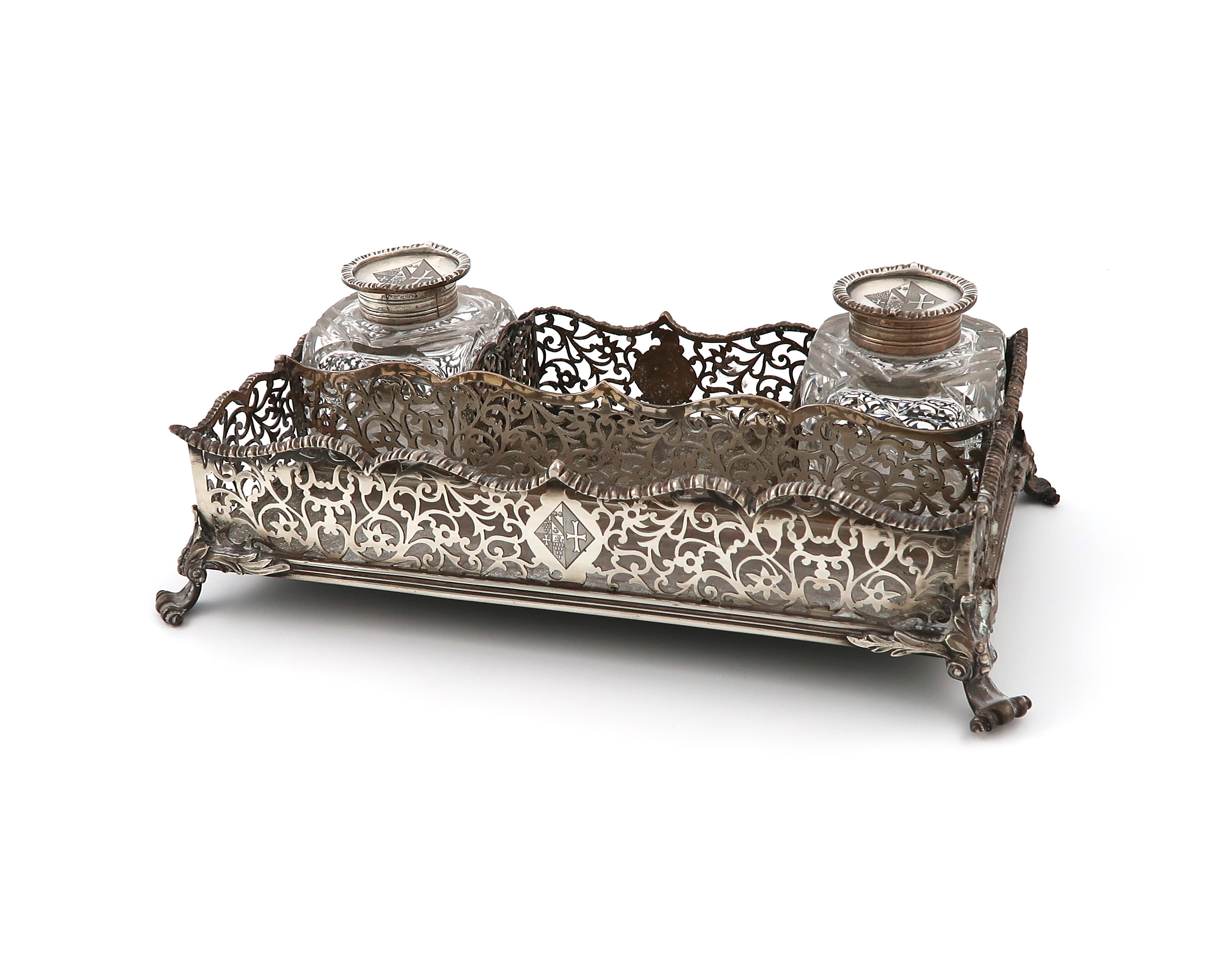 rectangular form, pierced foliate scroll gallery, gadroon border, on four scroll feet, with two silver-mounted cut glass inkwells, the hinged covers with gadroon borders and with an armorial, (one pin missing), length 25.2cm, approx. weight 17oz.