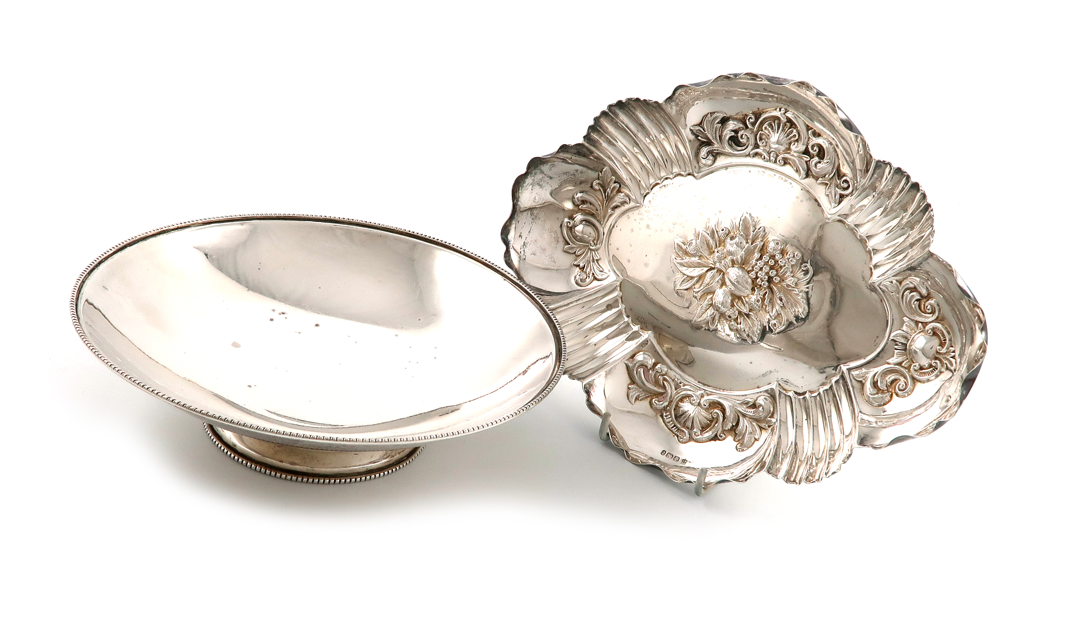 circular form, beaded border, on a raised circular foot, diameter 20.5cm, plus a silver dish, Sheffield 1895, lobed oval form, embossed with scroll and fruit, length 23.8cm, approx. weight 18.5oz. (2)