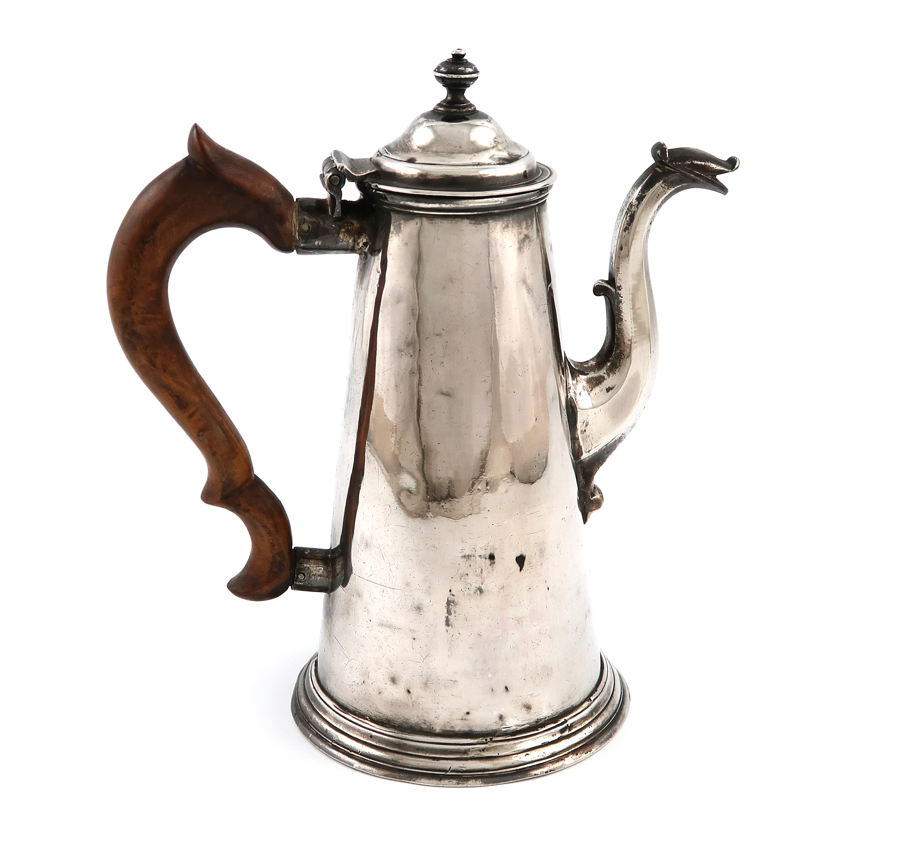 tapering circular form, wooden scroll handle, domed hinged cover with a knop finial, on a raised circular foot, height 19cm, approx. weight 19oz.