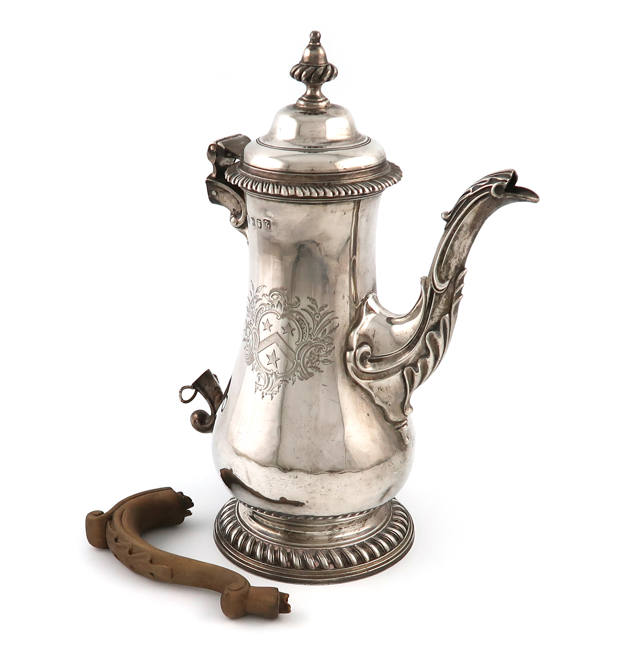 baluster form, leaf capped spout, the scroll handle a.f, domed hinged cover with a gadroon border and fluted acorn finial, engraved with an armorial within foliate scroll mantling, on a raised circular gadroon foot, height 27cm, approx. weight 28.4oz.