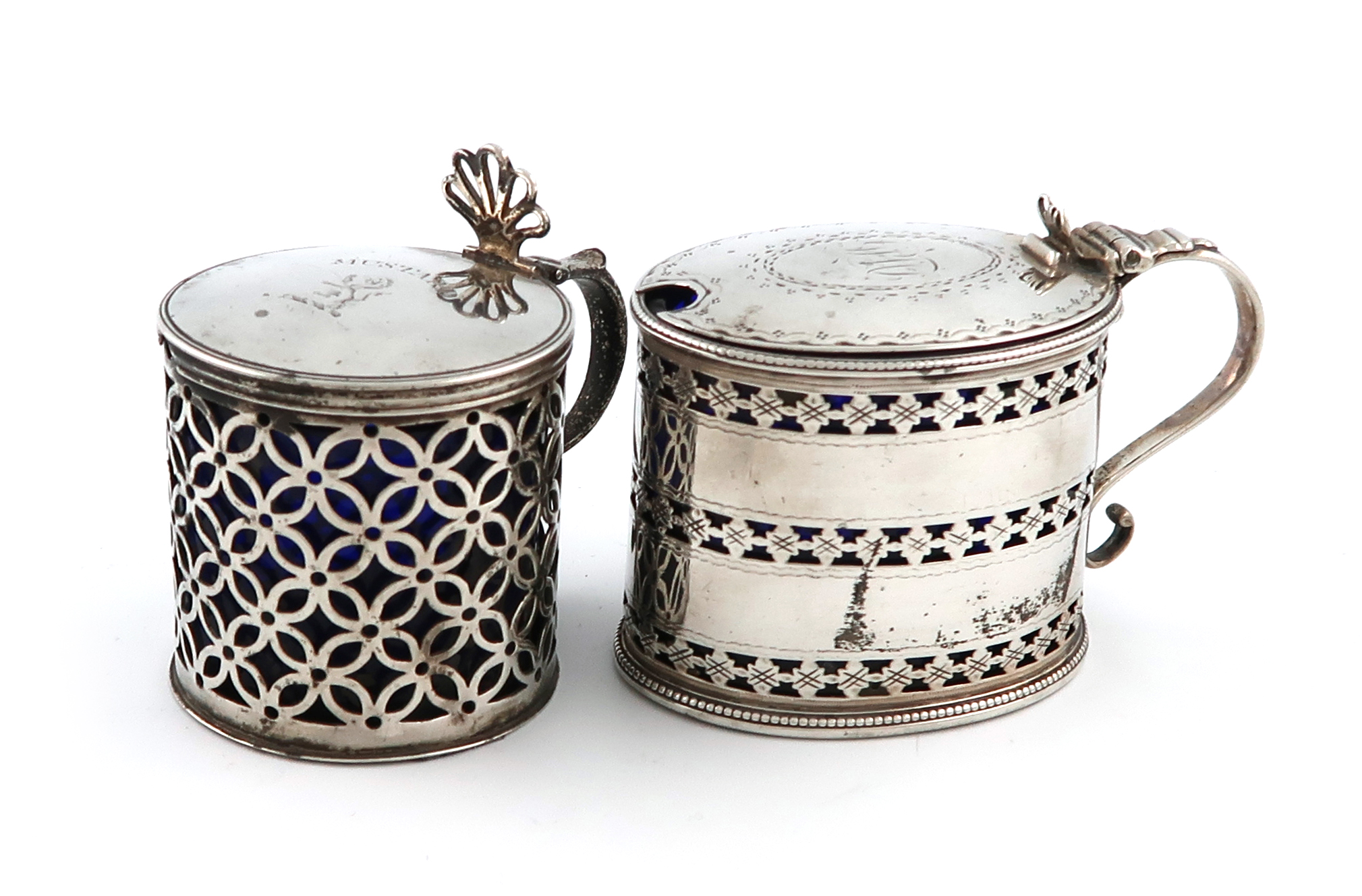 oval form, with three bands of pierced foliate decoration, beaded borders, with a blue glass liner, length 10cm, plus another George III silver mustard pot, by Aldridge and Green, London 1781, circular drum form, pierced decoration, the hinged cover with a crest and engraved 'MUSTARD', with a later blue glass liner, approx. total weight 6.4oz. (2)