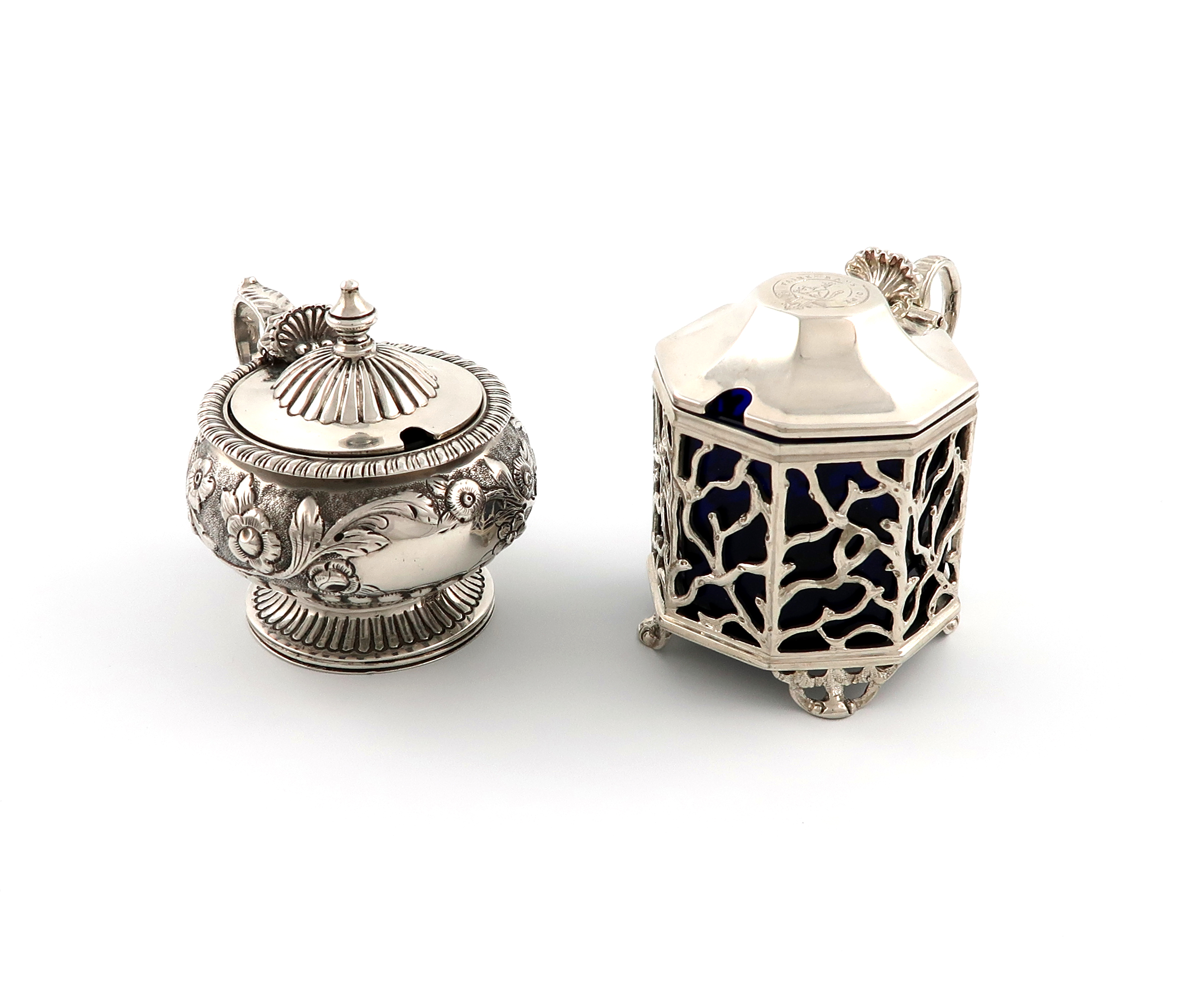 octagonal form, pierced intertwined coral or branch decoration, the hinged cover with a crest and monogram, scroll handle, on four pierced bracket feet, with a blue glass liner, plus a George III silver mustard pot, later over stamped with maker's mark of Frederick Elkington, London 1790, later embossed decoration, approx. total weight 9oz. (2)