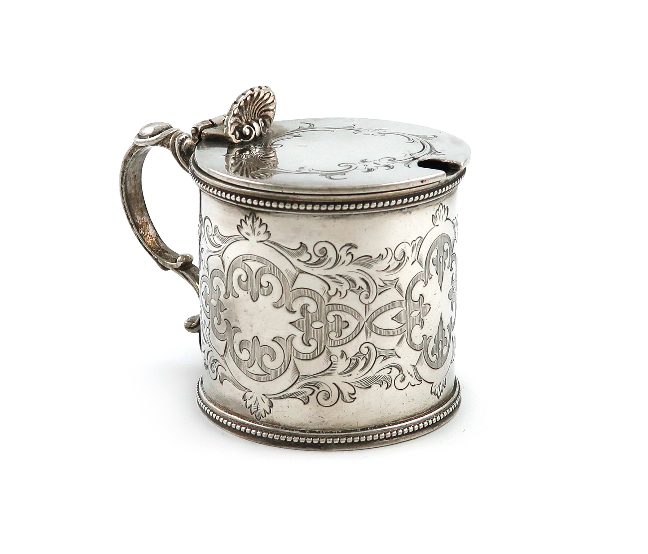 circular drum form, engraved foliate scroll decoration, beaded borders, scroll handle, with a blue glass liner, height 7cm, approx. weight 4oz.