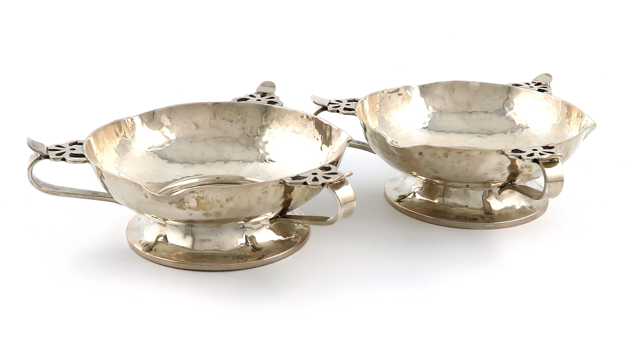 shallow circular form, pierced scroll handles, spot-hammered decoration, on raised circular bases, length 16cm, approx. weight 18.5oz. (2)