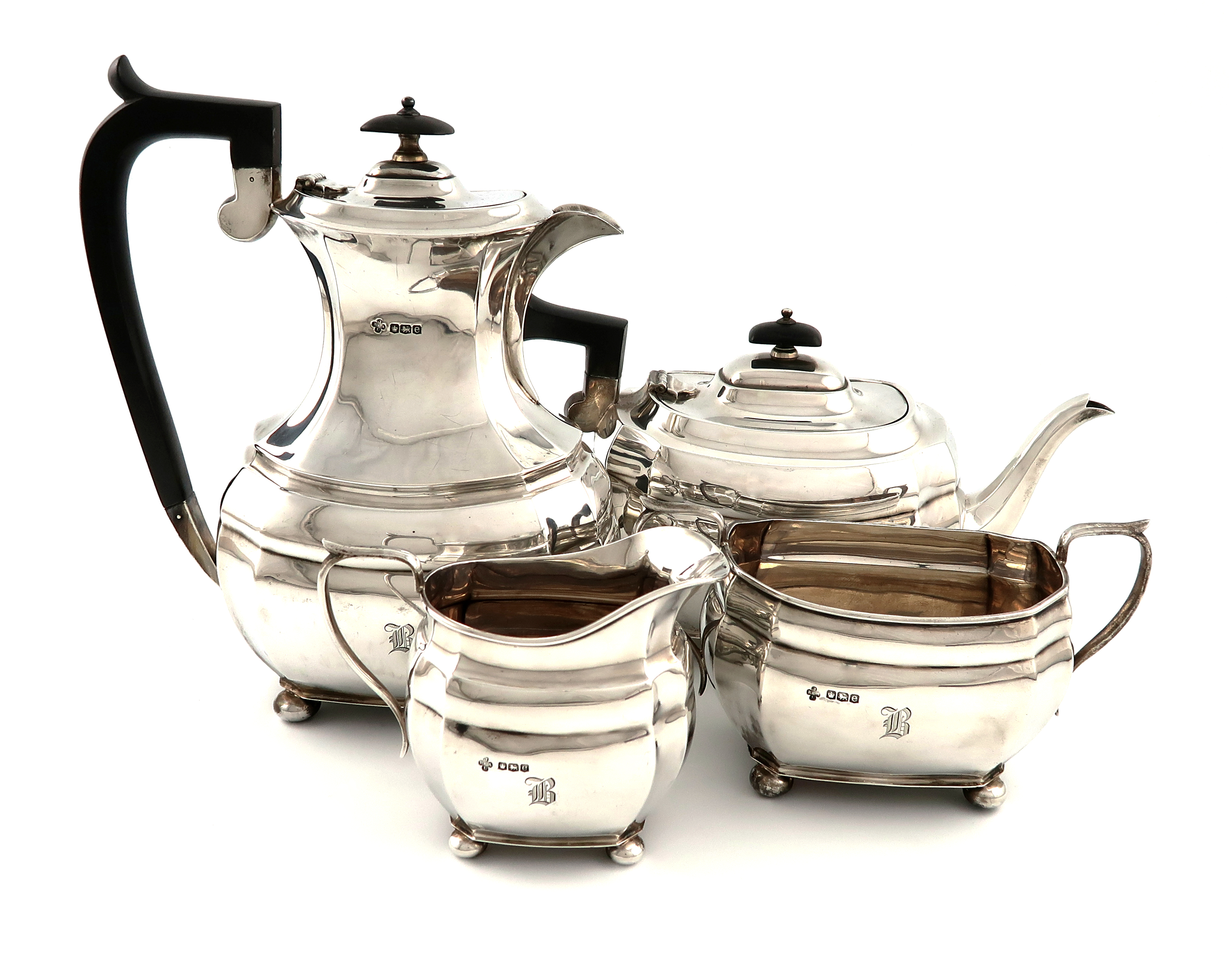 shaped oblong form, scroll handles, on four bun feet, length of teapot handle to spout 27.5cm, approx. weight 48oz. (4)